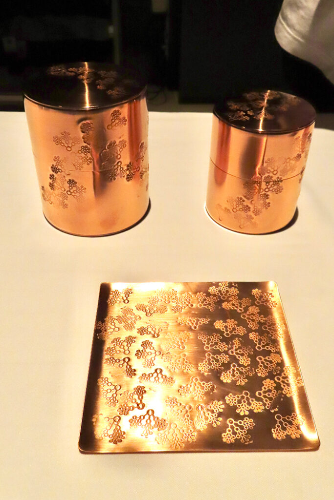 まず、京都の伝統的な茶筒を手がける「開花堂」の6代目八木隆裕氏は、酸化させた銅板に神経細胞の形を掘り込んだ金槌でひとつひとつ刻印していき、表面を磨き上げてオリジナルな茶筒を仕上げた。