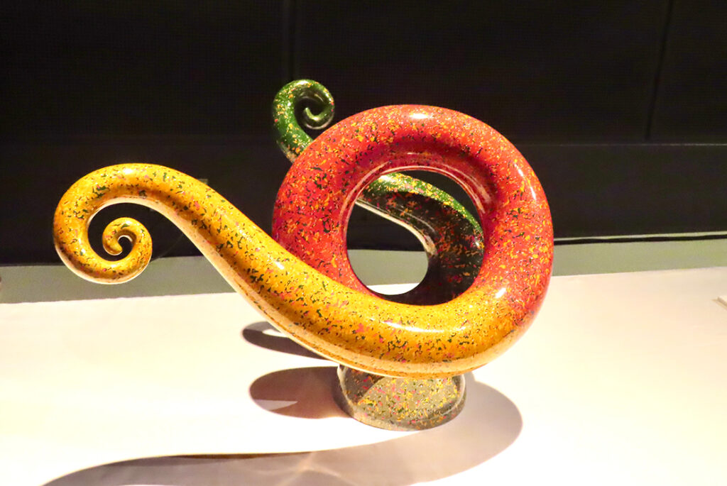 コンピュータ画面の中から、三次元に取り出した漆塗りの立体作品で、ニューロンが枝分かれする前の蔓が伸びた状態を再現。漆塗りの新しい技術と共に、神経細胞の成長の息吹が表現されたものだ。