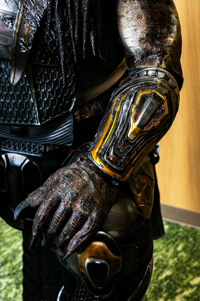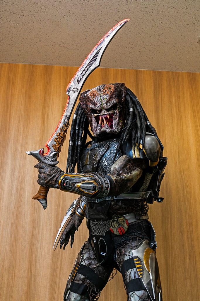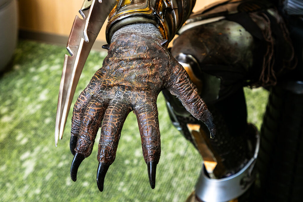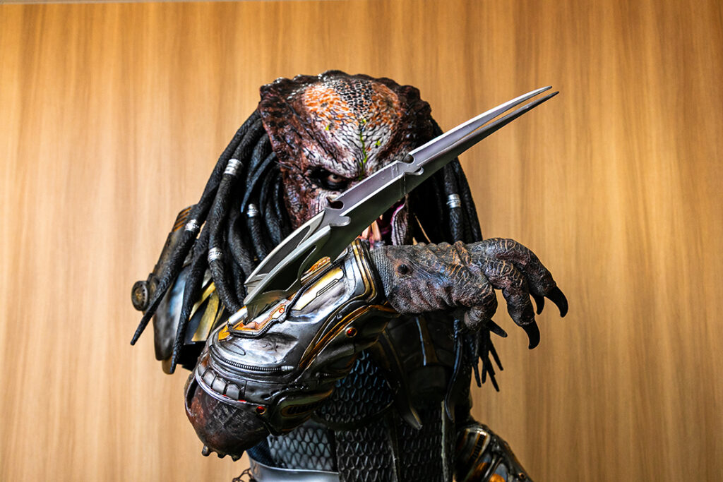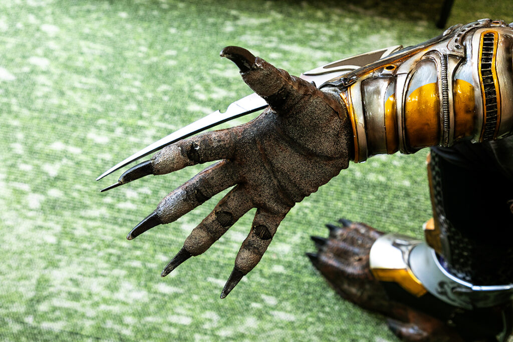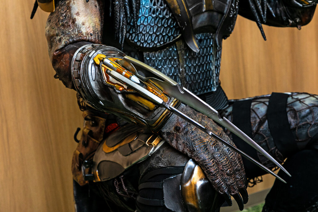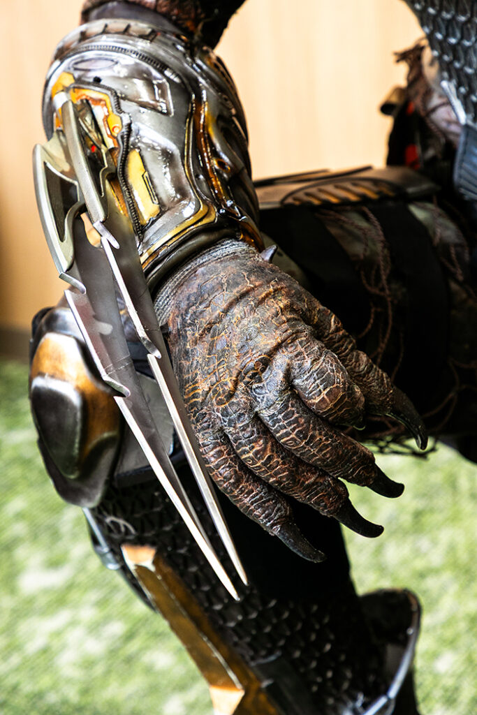 プレデターと言えば、原始的にして戦闘的なギミックの数々。その中でも右腕に装備された鍵爪状の刃物リストブレイドは象徴的な武器だ。「自分もお気に入りは断然リストブレイドです。映画中にどんな使い方をするのかいつも見ています」(コスプレイヤーさん談)