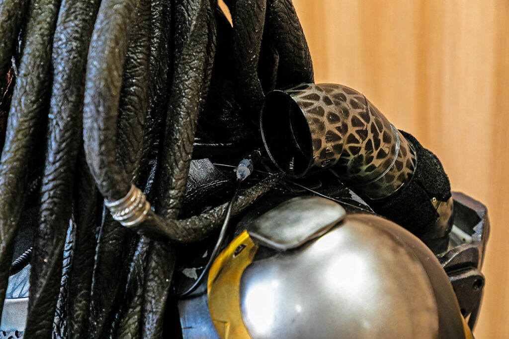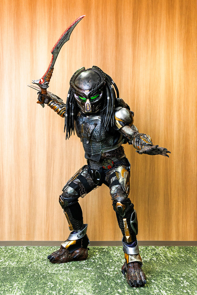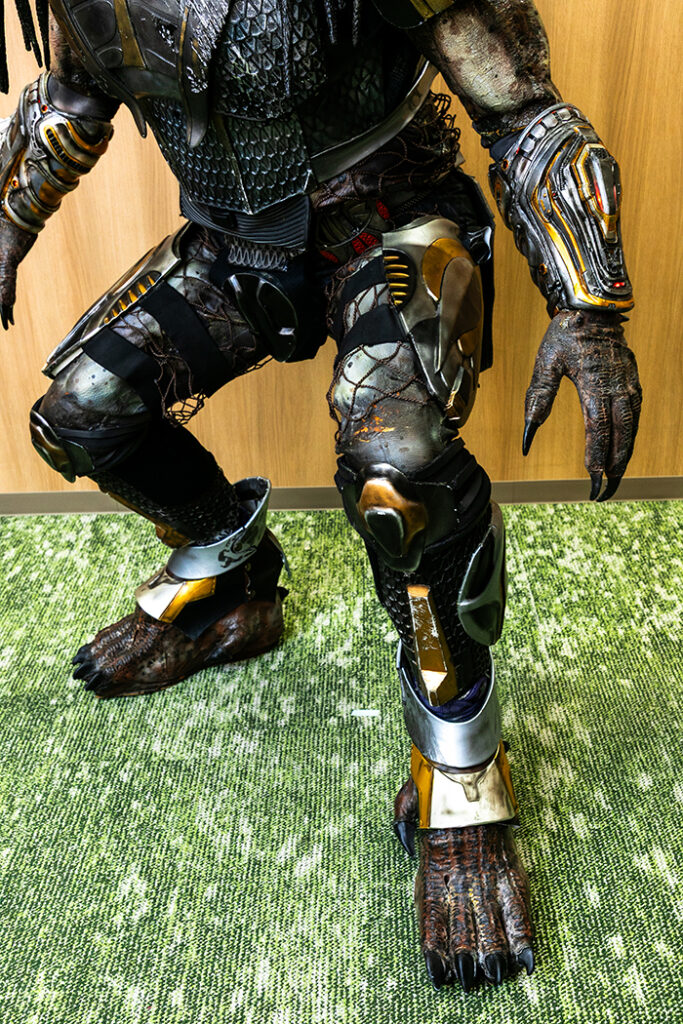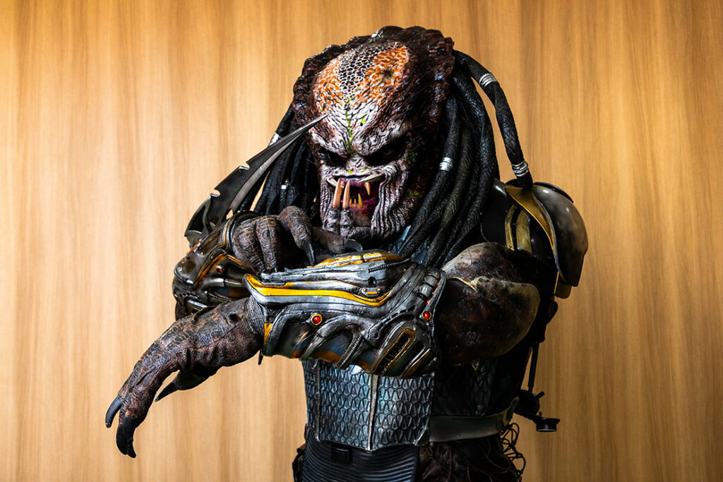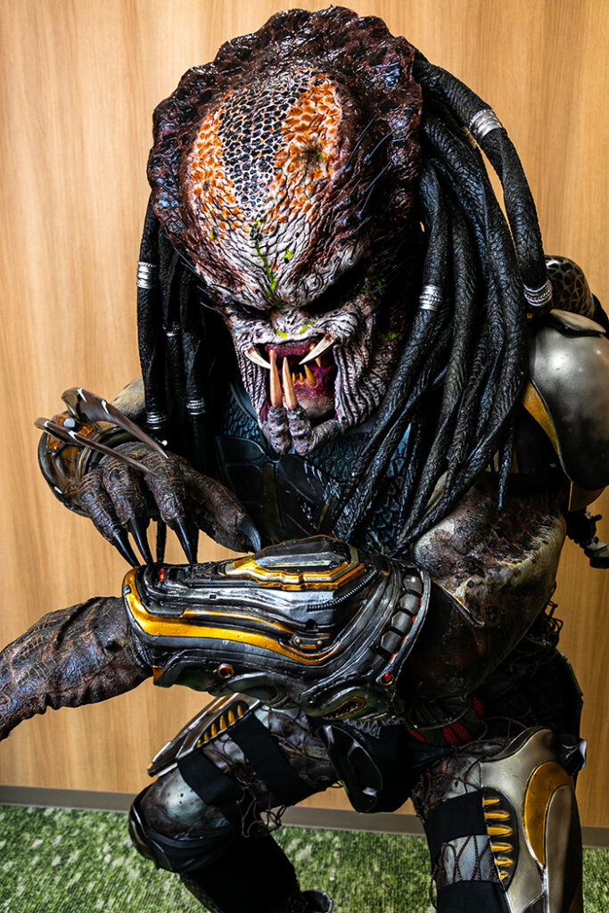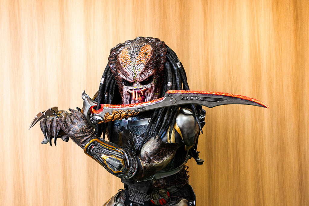 プレデターと言えば、原始的にして戦闘的なギミックの数々。その中でも右腕に装備された鍵爪状の刃物リストブレイドは象徴的な武器だ。「自分もお気に入りは断然リストブレイドです。映画中にどんな使い方をするのかいつも見ています」(コスプレイヤーさん談)