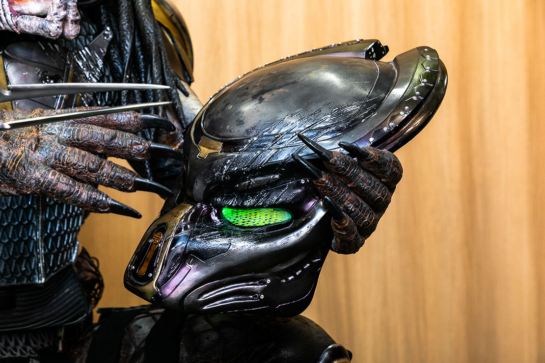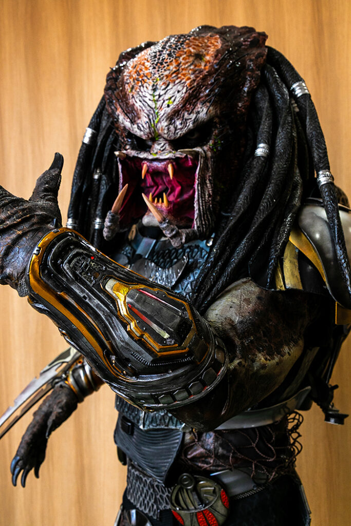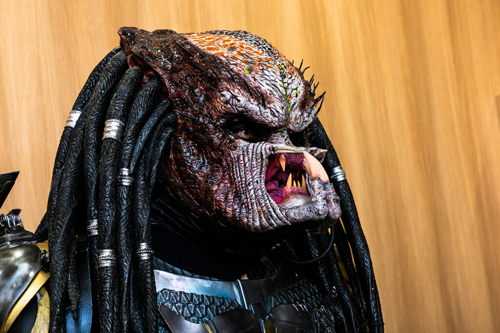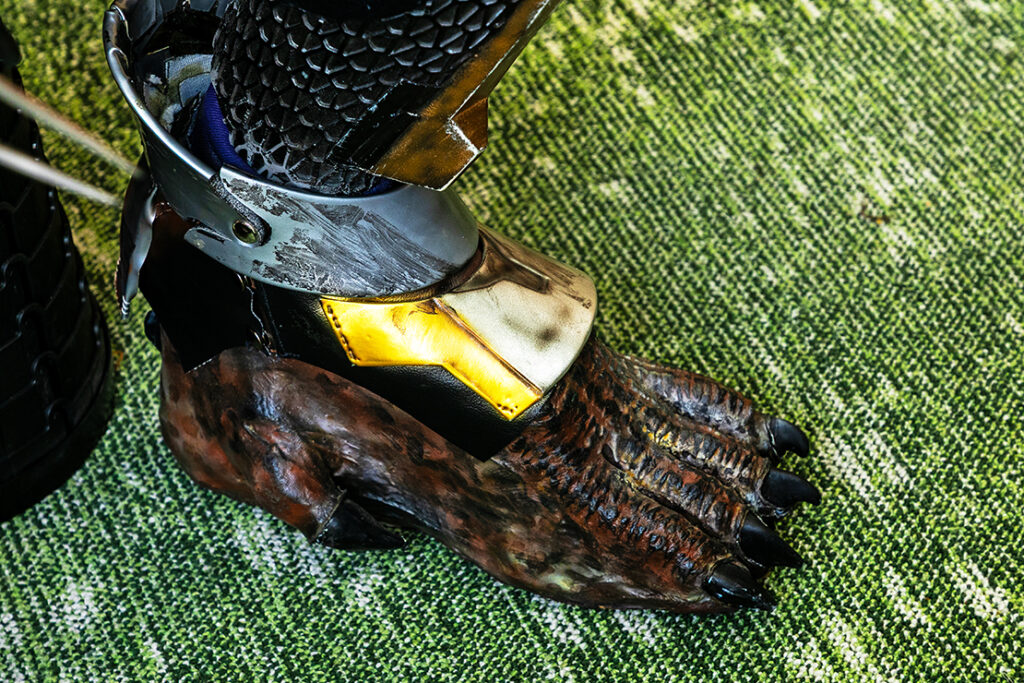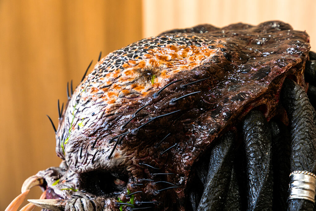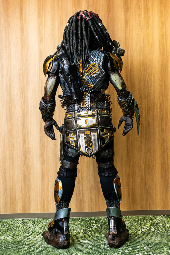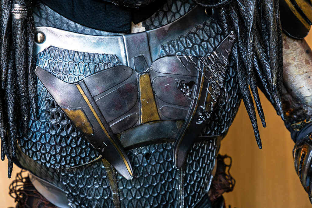 プレデターと言えば、原始的にして戦闘的なギミックの数々。その中でも右腕に装備された鍵爪状の刃物リストブレイドは象徴的な武器だ。「自分もお気に入りは断然リストブレイドです。映画中にどんな使い方をするのかいつも見ています」(コスプレイヤーさん談)
