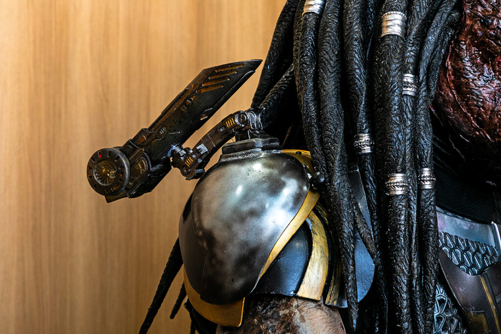 上半身の鎧部分。マスクだけではなく、胸部にも爪状の傷跡が施されている。プレデターの主要武器であるショルダー・プラズマキャノンが右肩に。左肩にはパルプ状のものが。