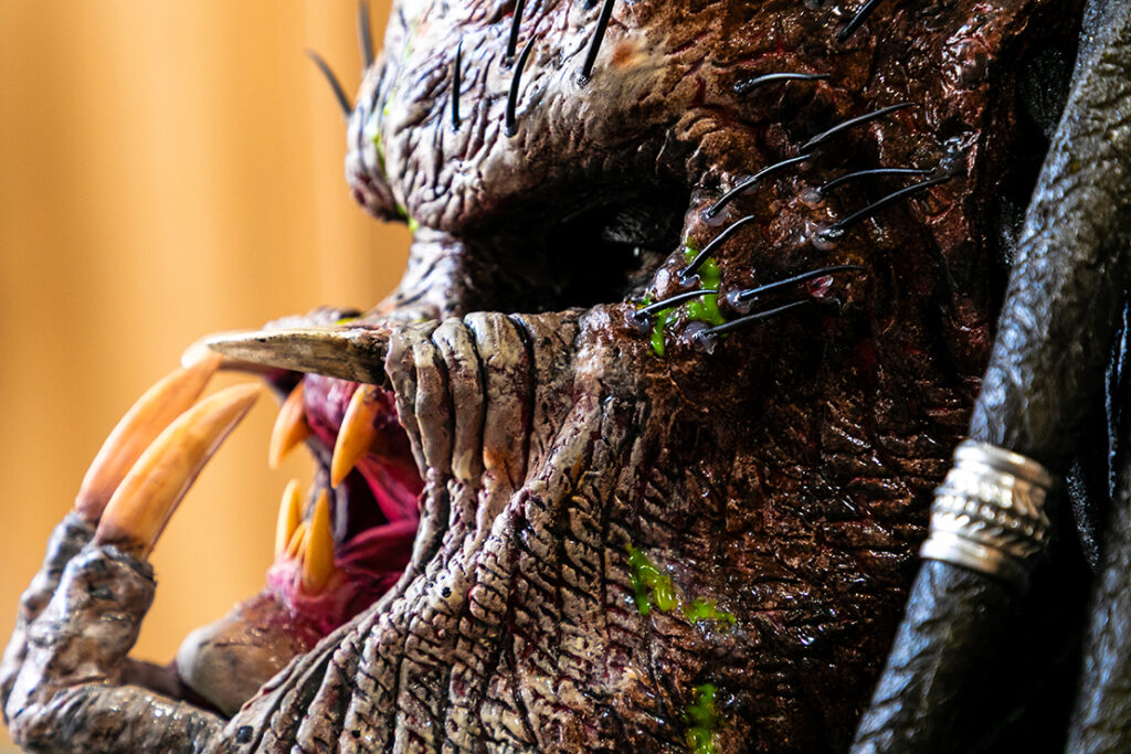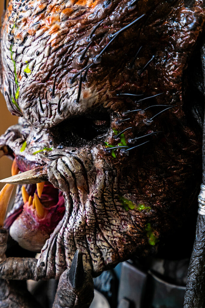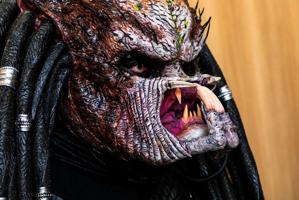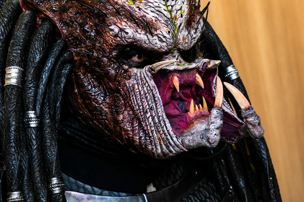 四方に大きくガバっと開くプレデターの顎。上を向いていた牙が開くと前に突き出してくるので、迫力満点。コスプレイヤーさん独自に考案した仕掛けで、自身の顎とワイヤーで連動している。