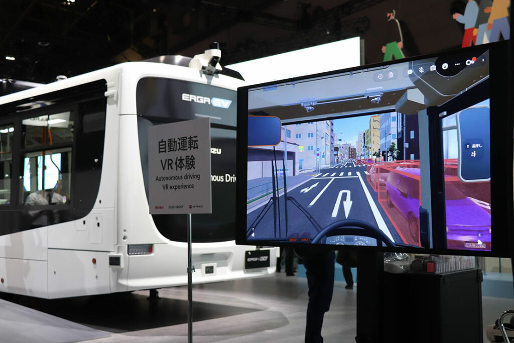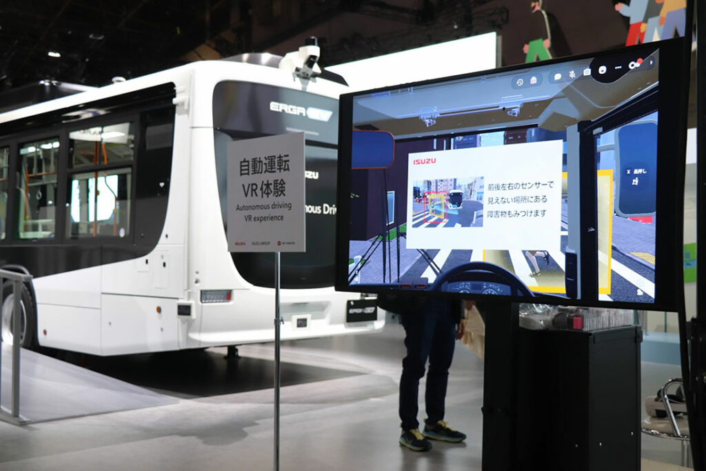 monoTVのスタッフが3Dゴーグルを装着し、無人運転バスの走行シーンを仮想空間で体験した。車両の周囲認識や制御の様子がリアルに再現された設計で、未来の公共交通の姿を直感的に理解できる内容だ。ちなみに、体験したスタッフは運転免許を持っていない。では、こうした無人運転バスが実用化された場合、免許なしでも “運転” できるのだろうか?
