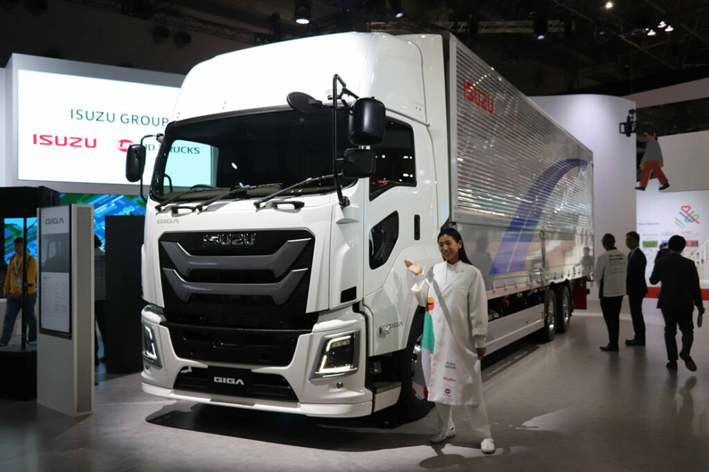 世界初公開となる新型「ギガ」。日本の物流を支える大型トラック。 約10年ぶりにキャブエクステリアを刷新。多彩な安全機能を搭載し、快適で安全な走行を提供する。このトラックは、長距離輸送や重量物の運搬に使われる、いすゞの主力モデルのひとつだ。