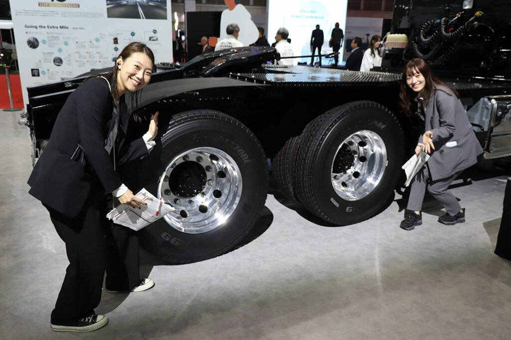 UDトラックスが2023年、13年ぶりに復活させたフラッグシップ級の大型トラクター(牽引車)。最大86トンの連結車両総重量に対応し、重量物輸送に特化した高性能モデルだ。3軸6輪のうち、後ろの2軸(4輪)が駆動輪、総輪ディスクブレーキに加え、大容量流体式リターダの圧倒的なブレーキ効力により安定した制動力を発揮。それにより牽引力と安定性を両立させている。その駆動タイヤの大きさは画像のとおりだ。