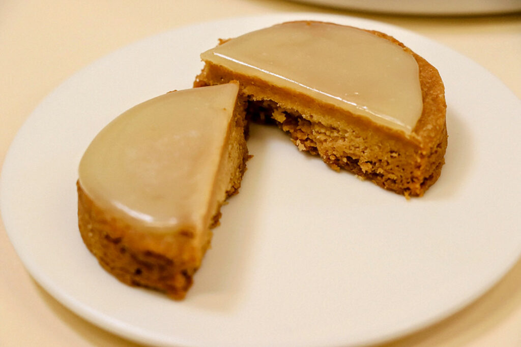 ざくっと香ばしいガレットに、自家製の生バターを溶かし込んだフォンダンをとろりと重ねてある。ガレットの豊かな風味と贅沢な味わいのあとに、フォンダンの深く心地よいコクと、生バターのやわらかな香りがふんわりと広がる。ザクザクとした生地となめらかな口どけが重なり合い、ひと口ごとに贅沢なおいしさが楽しめる。