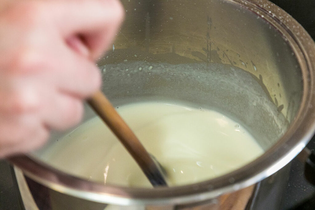 牛乳を少しずつ加えながら、ダマにならないように混ぜ、少しとろみが出るまで煮ます。塩・こしょう・ナツメグで味を調えます。