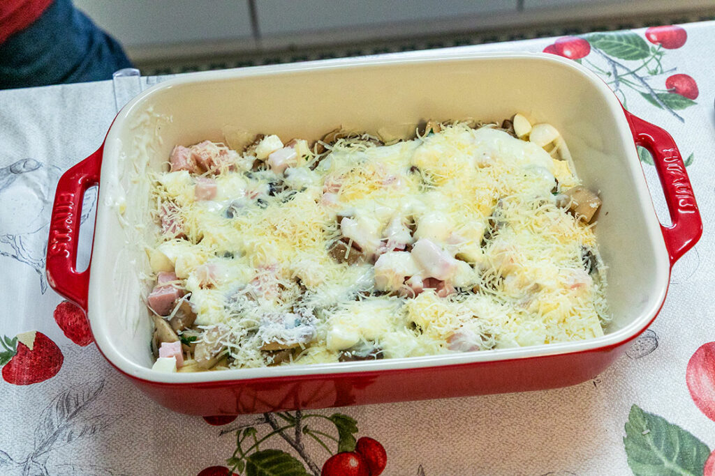 ラザニアシートを敷き詰めたら、その上に、きのこ、角切りにしたハムとモッツァレッラチーズ、ベシャメルソース、パルミジャーノチーズを順に重ねていきます。