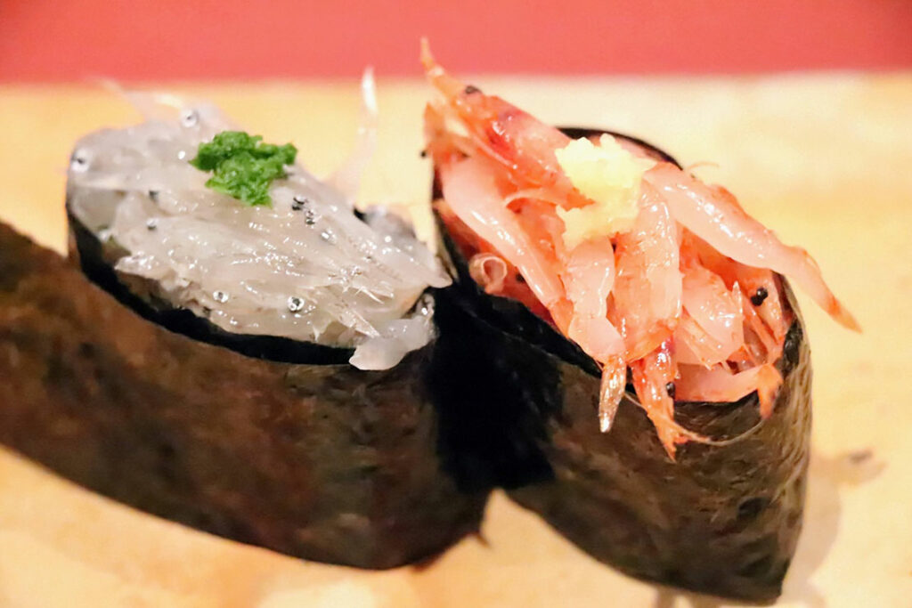 駿河湾特産の桜えびは、秋漁で水揚げされた新鮮な生を軍艦巻に仕立てて提供。吉田町産の生しらすの軍艦巻とともに、江戸前寿司の技を堪能できる逸品だ。鮮度抜群の生しらすと生桜えびは、口の中で相模湾の潮の香りがふわりと広がり、海の恵みを存分に味わえたぞ。