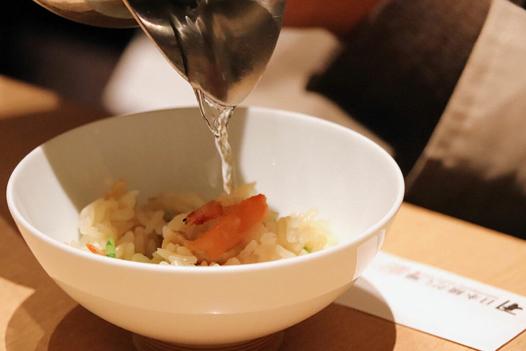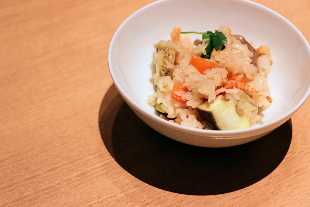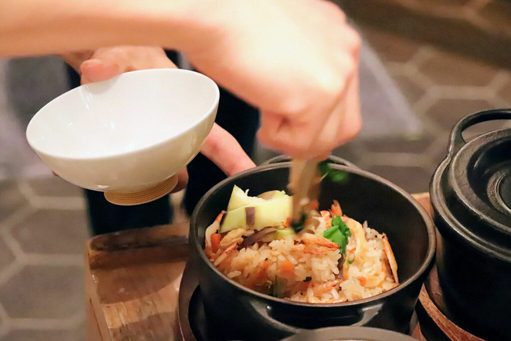 折戸なすと桜えびのうま味を堪能できる炊き込みご飯。出汁の効いたアツアツご飯は、豊かな風味が口いっぱいに広がる一品。仕上げには、かつおだしを注いでお茶漬けとしても楽しめる二度美味しい、まさに “しずおか食堂” の真骨頂だ。