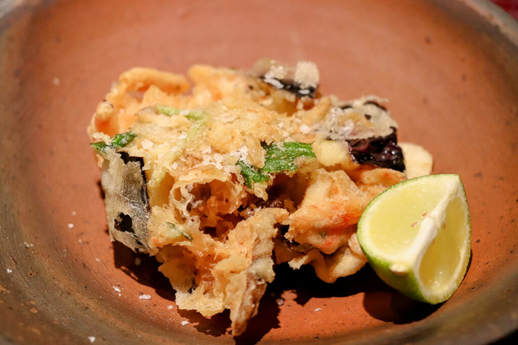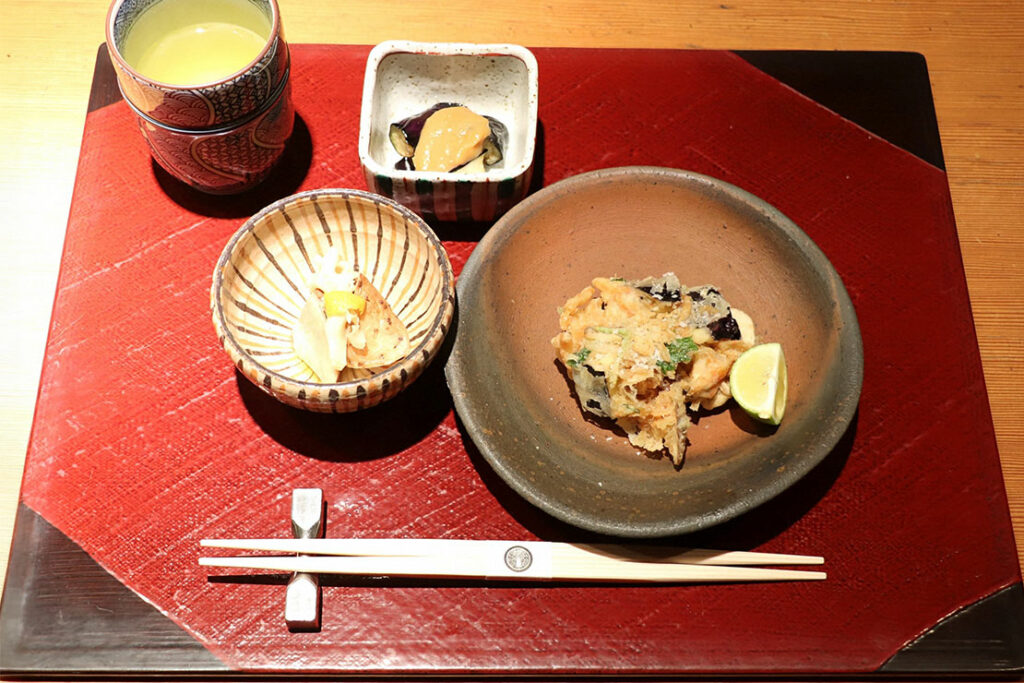 静岡市の伝統野菜「折戸なす」は味噌田楽、桜えびは折戸なすや銀杏とかき揚げ、ホホホタケと自然薯は柚子風味の和えもの、最後のデザートは、レッドオーレトマトのジェラート。鉄人が腕を振るう料理は静岡の食材がひかる美味しい一皿ばかりだ。
