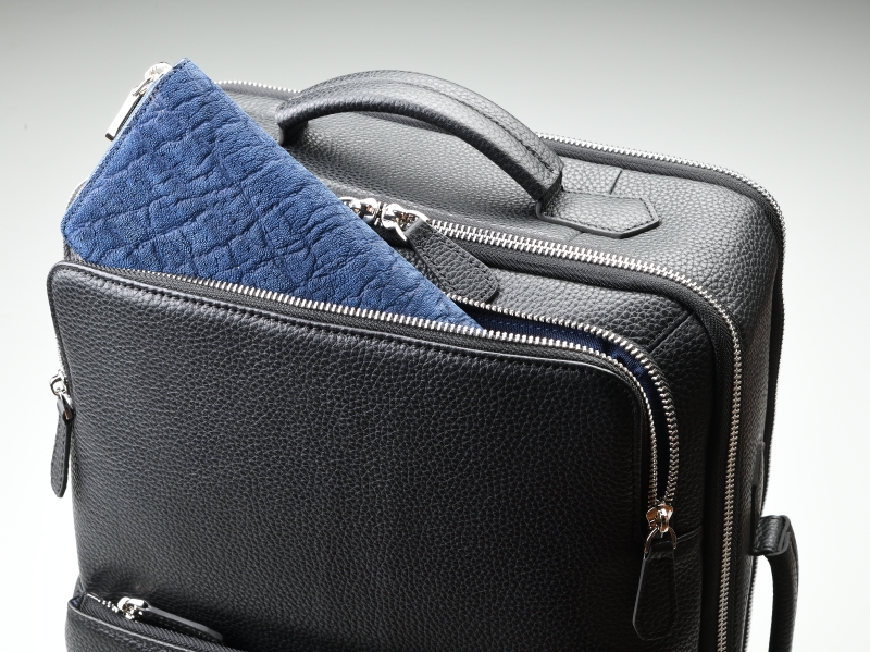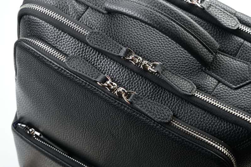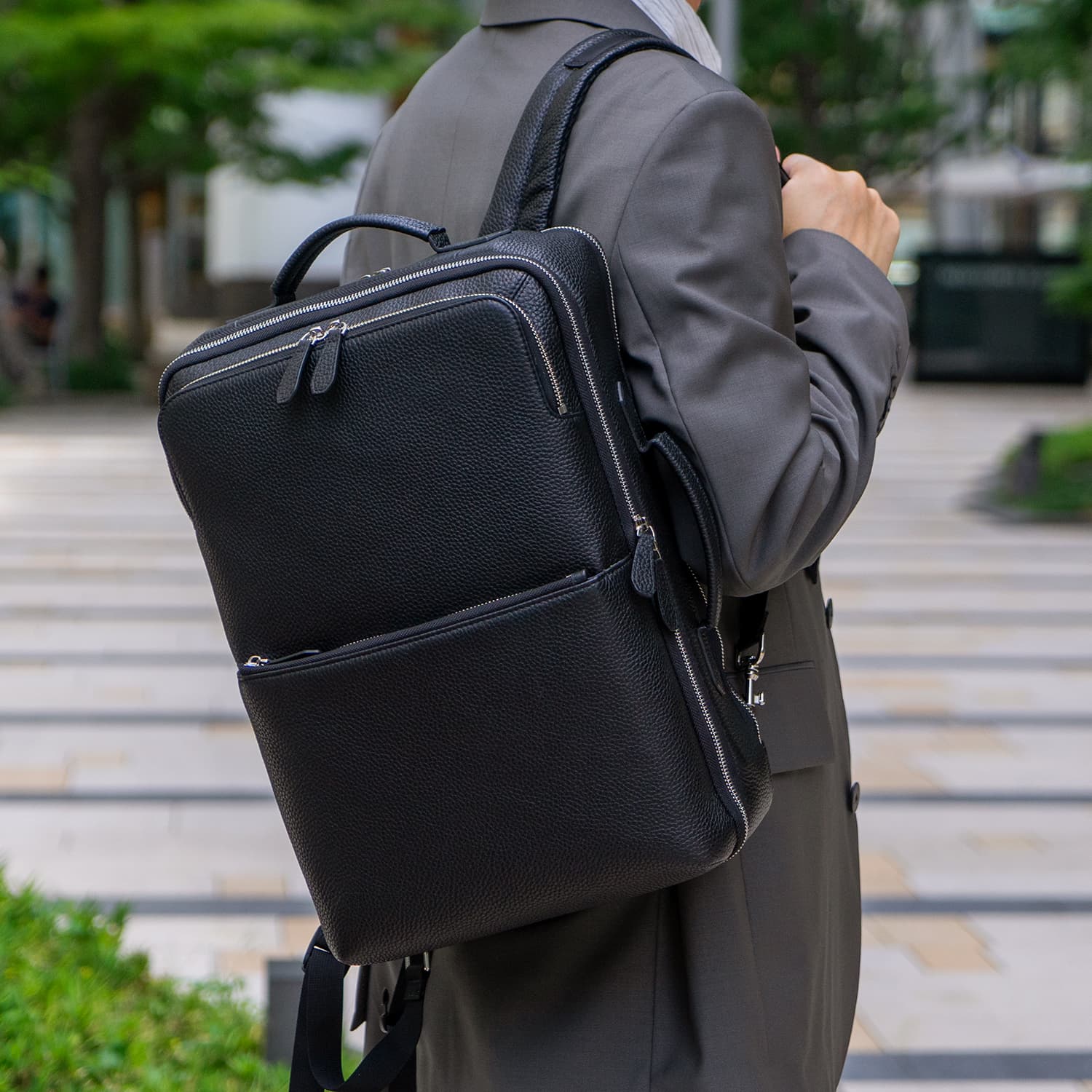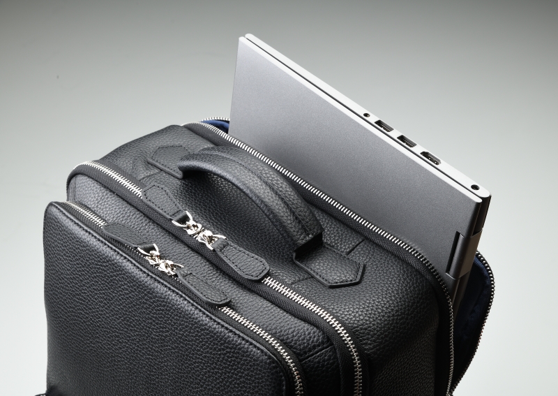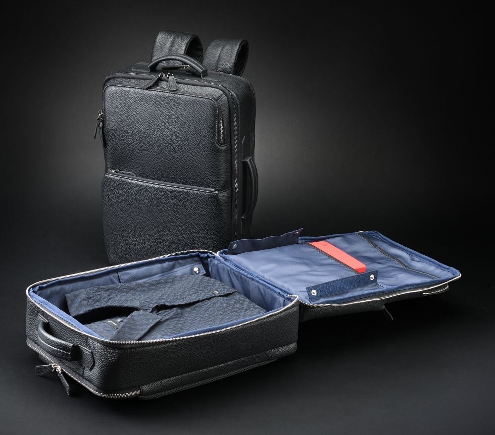 ビジネスリュックにおいても上記の理念は変わらない。良質なレザーに特殊な防水加工を施し、ビジネスやトラベルを充分に考慮した機能が備わっている。バックパックと手提げの2WAYスタイルで、ササマチを外せばスーツケースのように180度開けることが可能。1~2泊程度の出張にも対応し、オフィスから出張先への移動も効率よく行なうことができる。