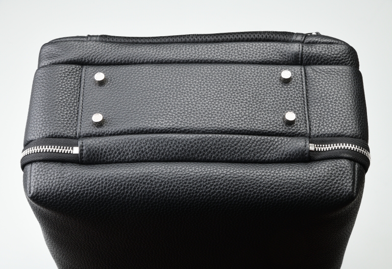 バックパックながら自立が可能。底面に打たれた底鋲が安定を保ち、床置き時の底革の摩耗も防いでくれる。