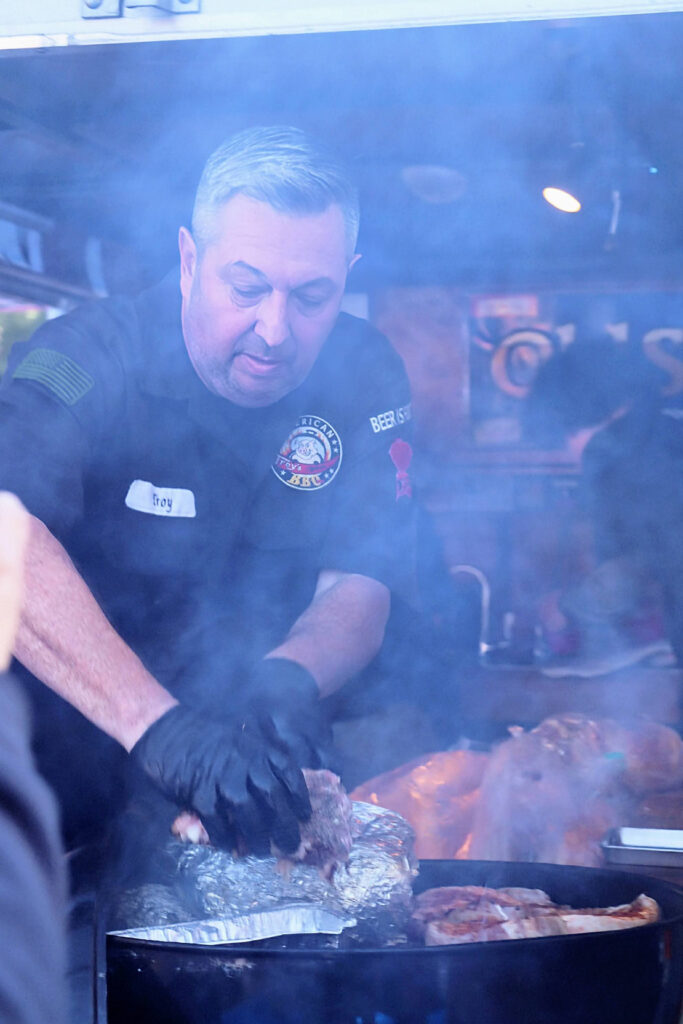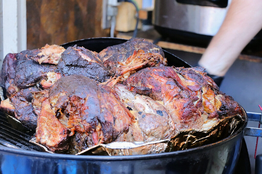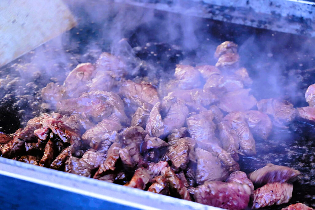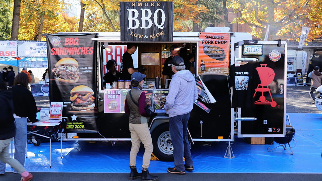 オープン前から肉を焼く煙と食欲をそそる香りを漂わせる「Troy’s American BBQ」。あっという間に人が列をなし、オーナーは「やばいよ、やばいよ」と連呼しながら肉と格闘。豪快に肉の塊をグリルへとのせる姿は、まさにアメリカンスタイル。