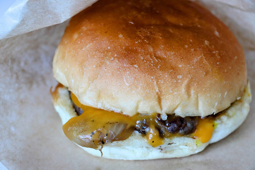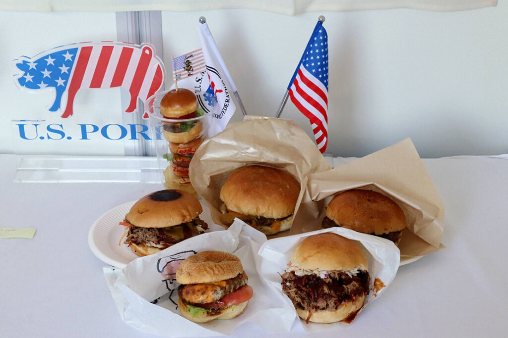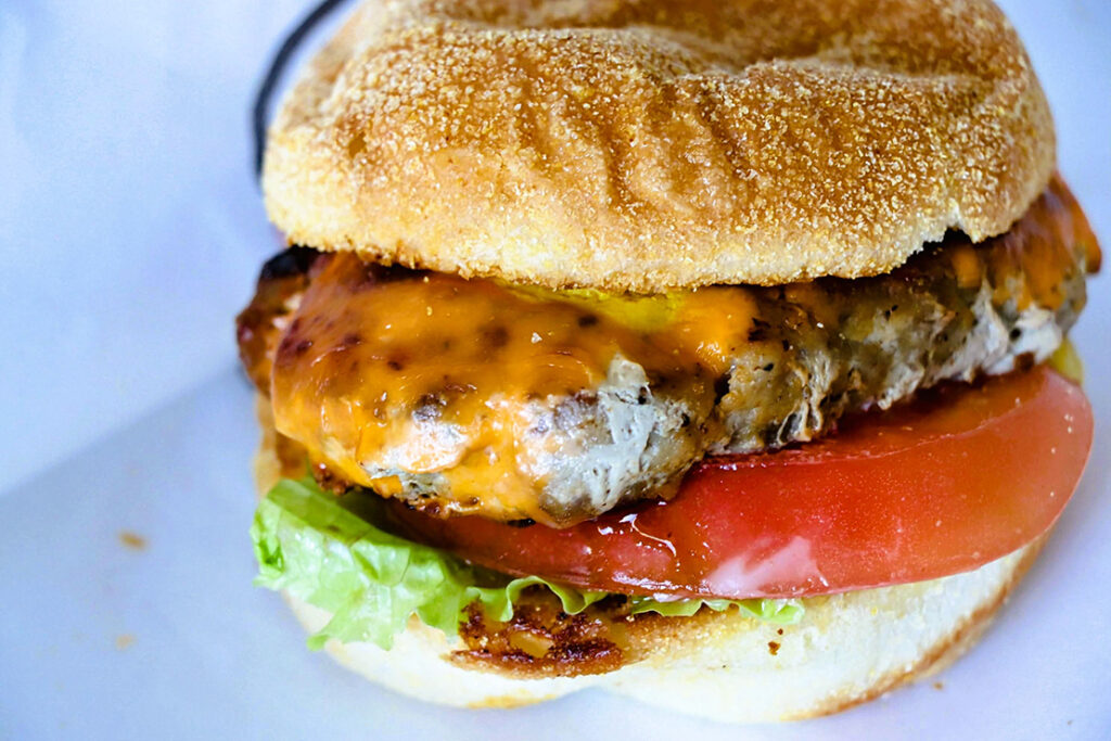 アメリカ産ポークのボストンバットを使ったハンバーガー「BBB(ボストンバットバーガー)」。チーズとタルタルソースがかかった特製照り焼き風ポークパティは相性バツグン。
