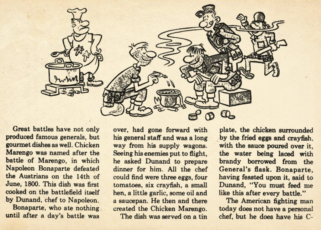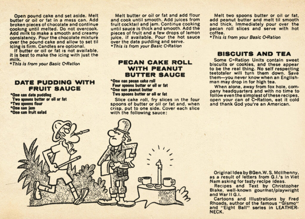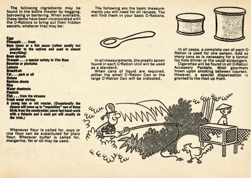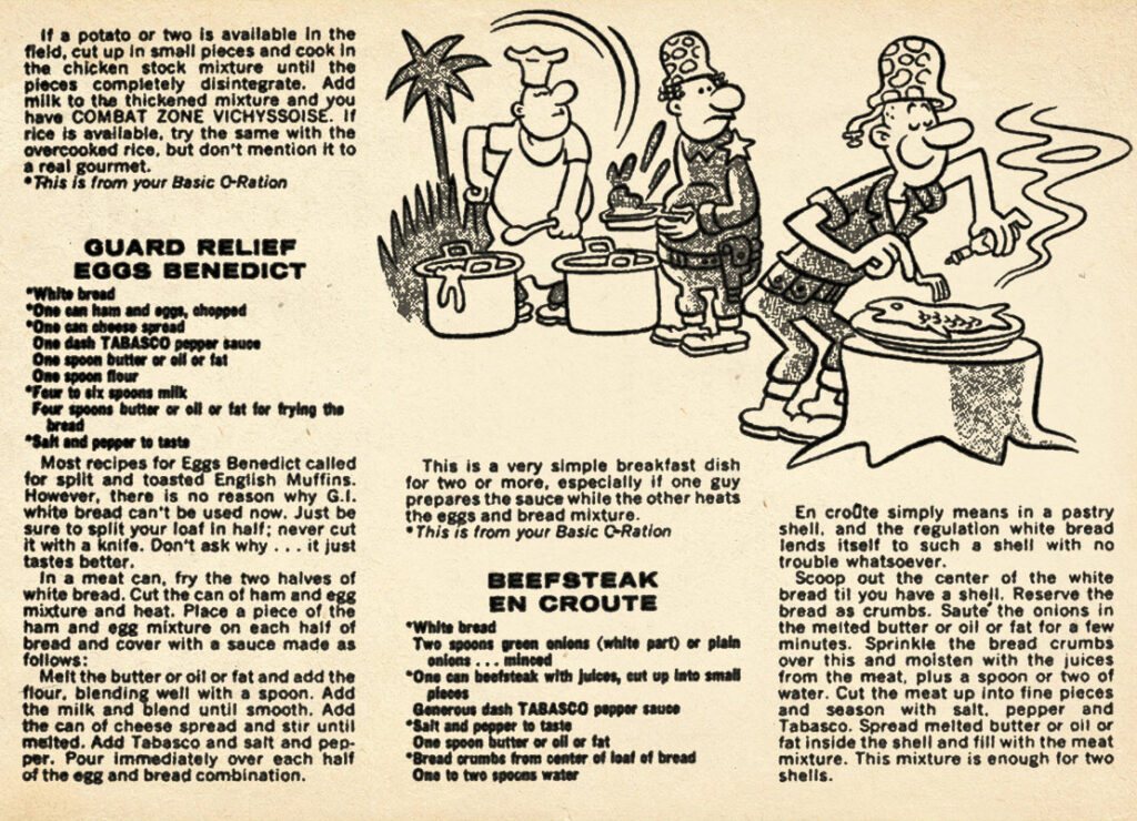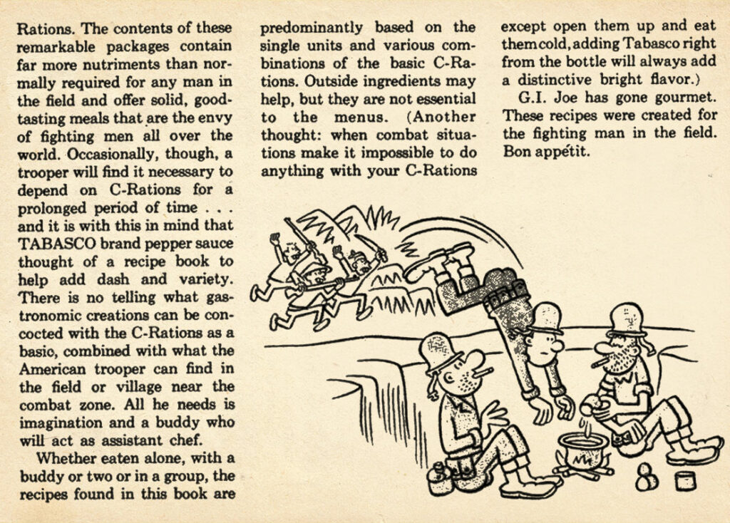 ベトナム戦争が長引くうちに、MCIと味変の雄であるチリソースの仲が切っても切れないものになった。そんな中、チリソースの第一人者タバスコで有名なマキルヘニー社は、MCIに手を加えて食生活を豊かにするためのレシピブックを作ったのだ。タバスコが詰め込まれたケースに同封されてベトナムに送られたこの本は、言うなればベトナム戦争限定の付属品でコミカルなイラストと簡単な調理法が記されていた魅力的な一冊である。ここでは、その一部を紹介しよう。