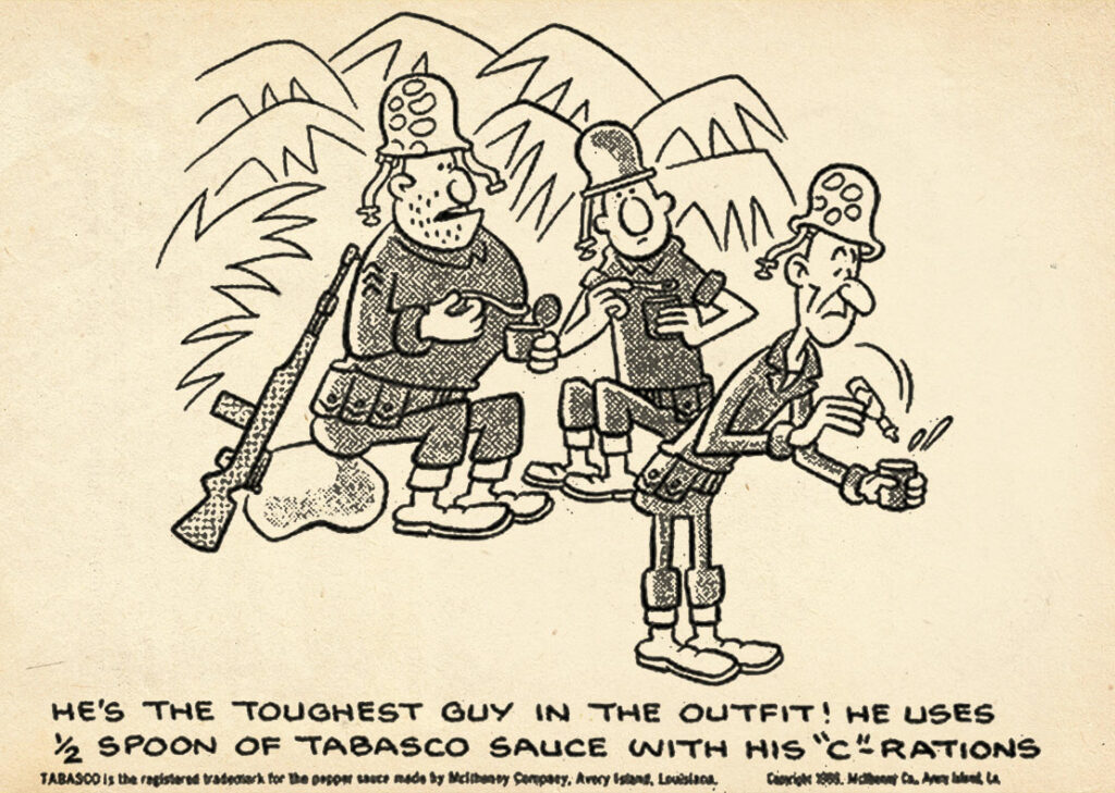 ボウイナイフの上で火にかけられているのは当時流行した「Cレーションピザ」でBユニットのクラッカーを生地代わりに使いMユニットの肉とチーズスプレッドで混ぜ合わせた具材を乗せてタバスコをかけた代物。マキルヘニー社が単調になりがちな戦場メシと兵士の苦悩を知っていたのは二代目社長のウォルターマキルヘニーが海兵隊員として第2次大戦に従軍し、太平洋戦線で日本軍と戦った経験を持っていたからで退役時に准将まで昇級した彼には “タバスコマック” という愛称があった。