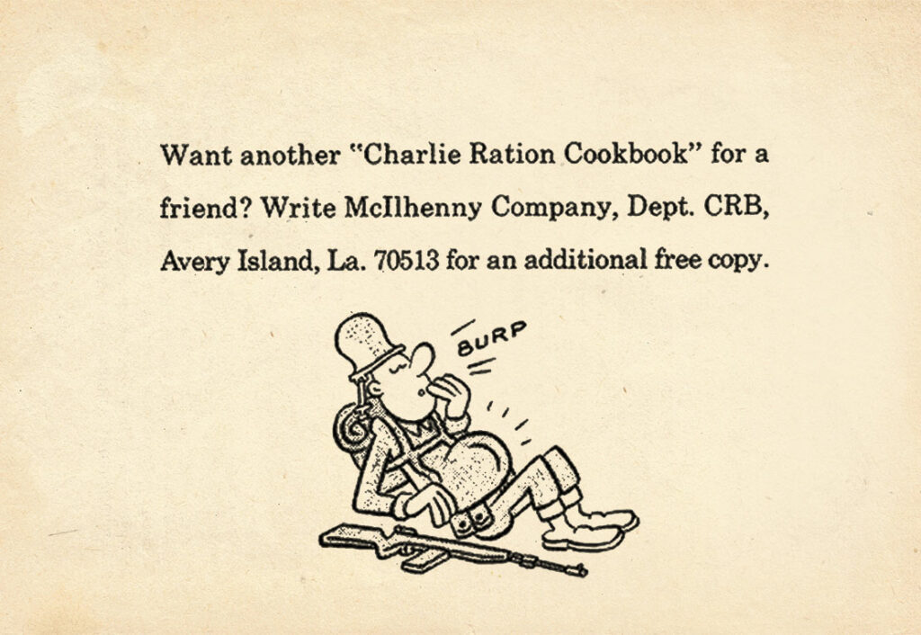 ベトナムではほとんど条件反射的に用いられていたタバスコは1年間の従軍期間で兵士たちをすっかり虜にしてしまったようで、アメリカに帰国した後も手放せなくなった者が大勢いたらしい。レシピブックの最後には「ご友人にも『チャーリー・レーション・クックブック』を贈りたいですか? 追加の無料コピーをご希望の場合は、マキルヘニー社までご連絡ください」。そして「げっぷ」とある。