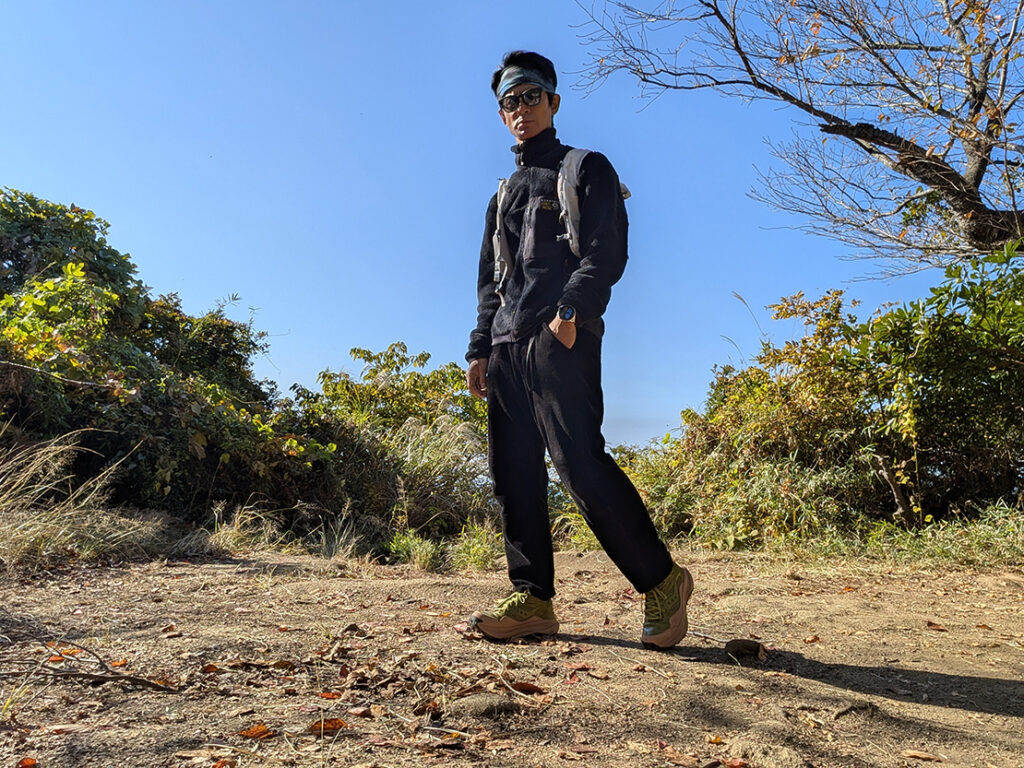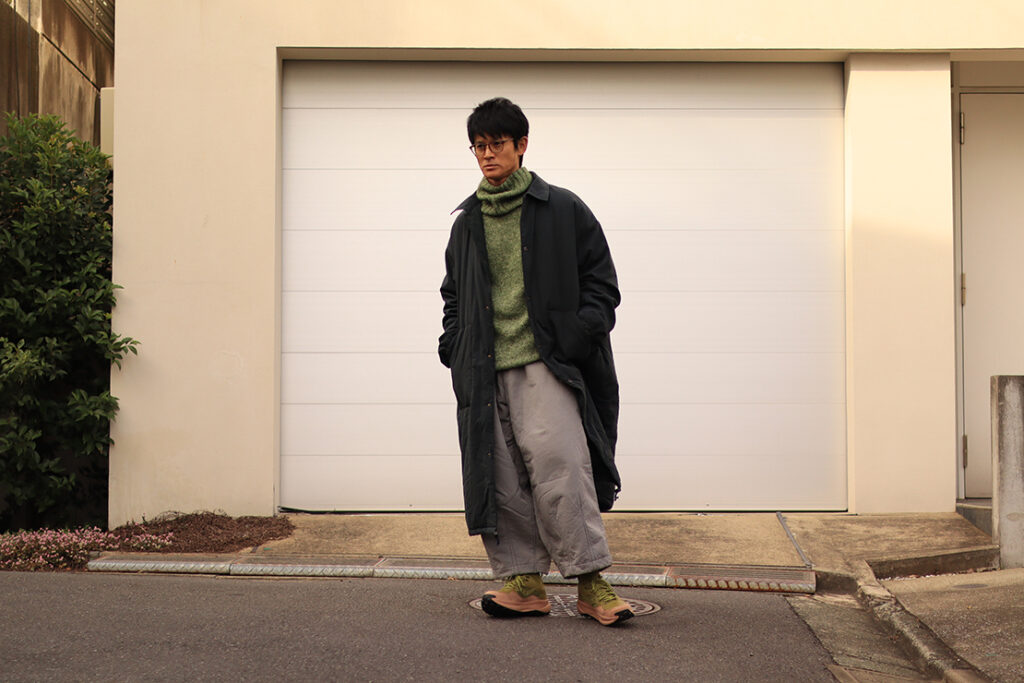 昨今のファッションシーンでは、機能性を重視した「テックウェア」や「ゴープコア」が定着している中で、トレッカー エスが持つ、ある種の「真面目さ」や「素朴さ」は、逆に新鮮。過剰なデザインがなく、全てのディテールが「トレイルで必要だから」という理由に基づいている。その実直さこそが、かえってコーディネートに奥行きとリアリティを与えてくれるのだ。僕は、トップ画像のように、ALLYOURSのロングコート、ジョンスメドレーの緑色のタートルネックニットにグレーのワイドパンツを合わせて、メガネをかけて、モードな感じにしてみた。実物を見ると本当にデザインがいい。