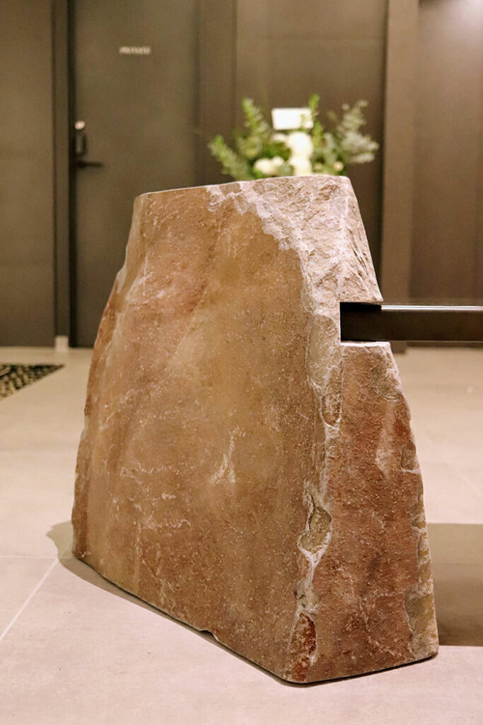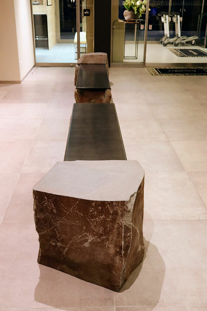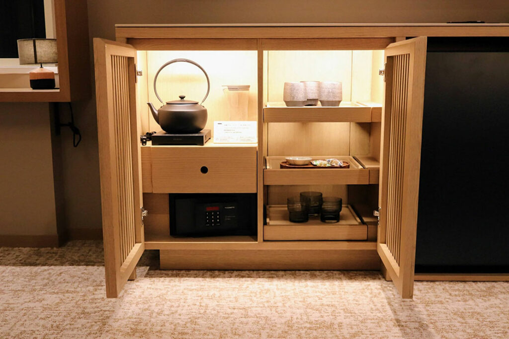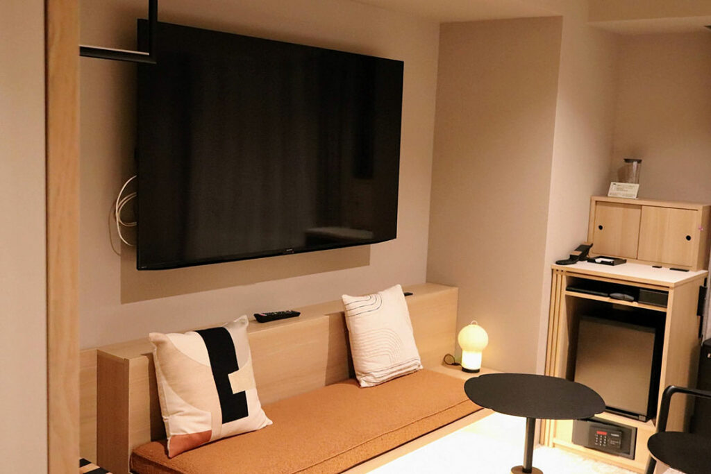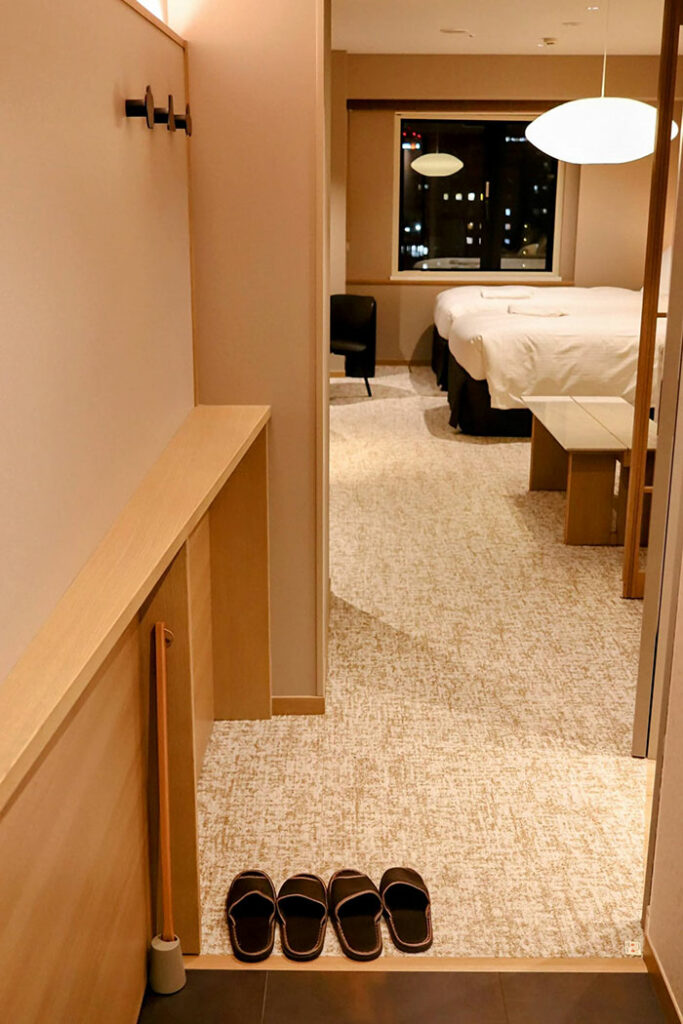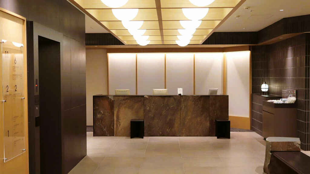 浅草の灯り⽂化を象徴する提灯格⼦や、⼀⽂字ぼかし(いちもんじぼかし)を⽤いたアートワークを配し、素材には 浅草寺にも使⽤される小松石や黒波風仕上げを採⽤。“静寂と陰影の美” を随所に携えた空間になっている。アメニティはフロント横に設置され、使う分だけピックアップするようになっている。