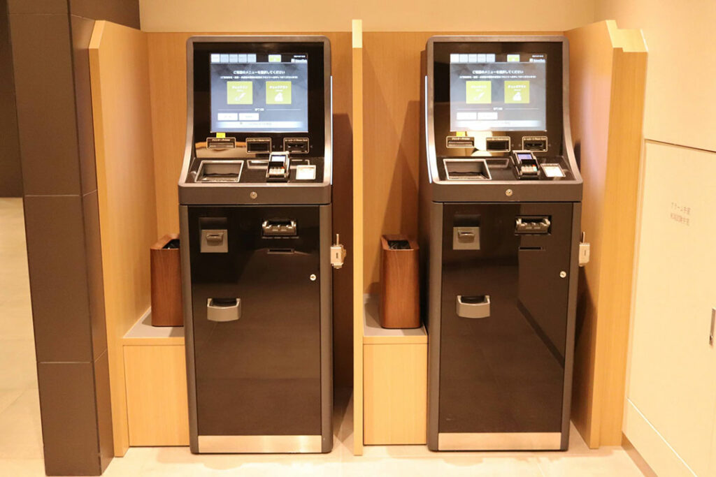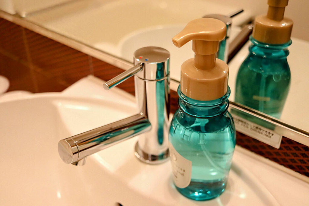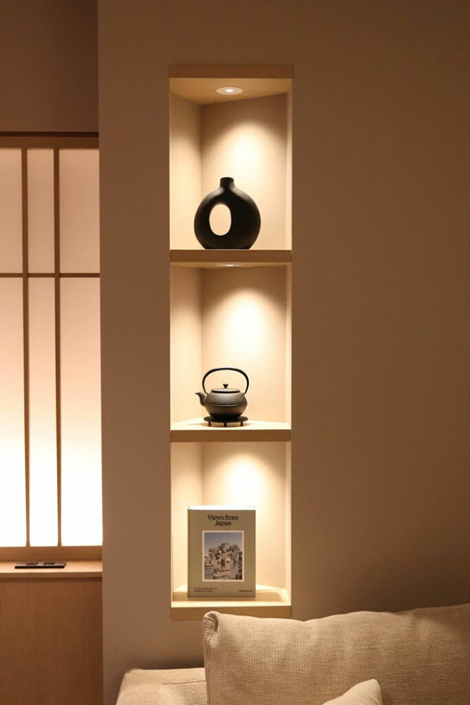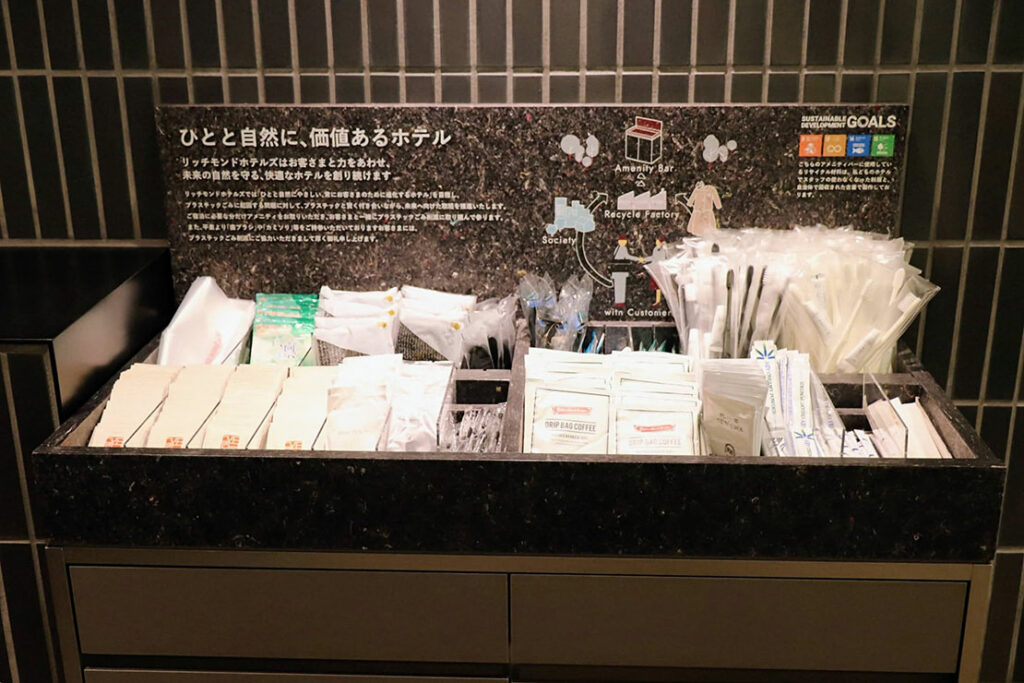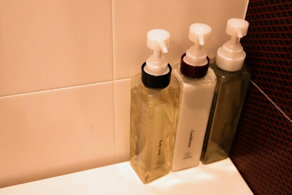 浅草の灯り⽂化を象徴する提灯格⼦や、⼀⽂字ぼかし(いちもんじぼかし)を⽤いたアートワークを配し、素材には 浅草寺にも使⽤される小松石や黒波風仕上げを採⽤。“静寂と陰影の美” を随所に携えた空間になっている。アメニティはフロント横に設置され、使う分だけピックアップするようになっている。