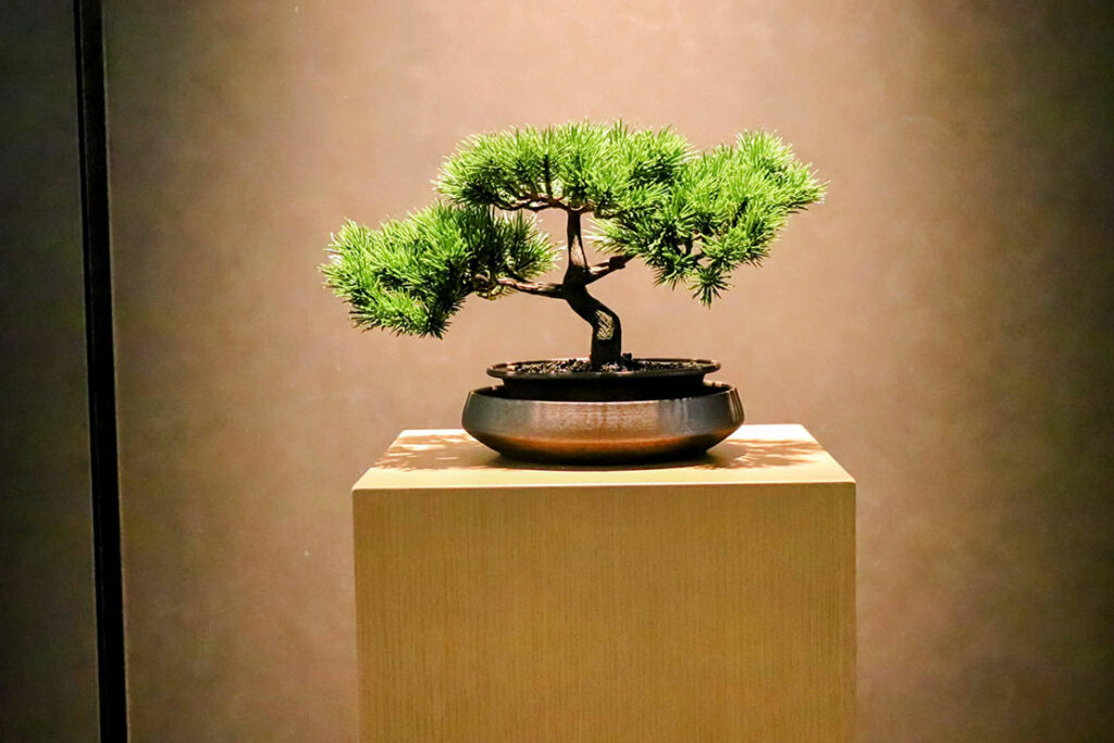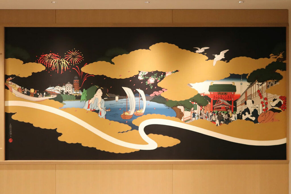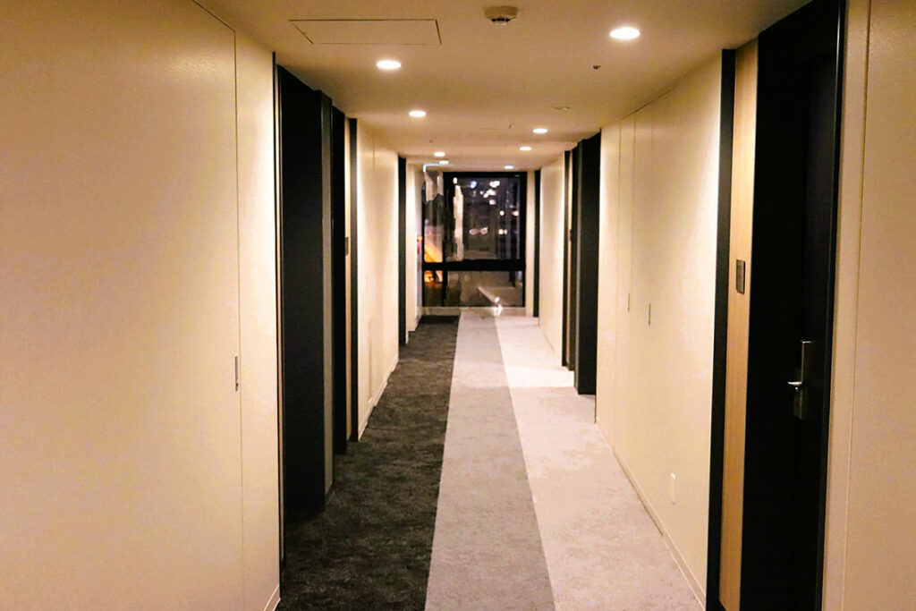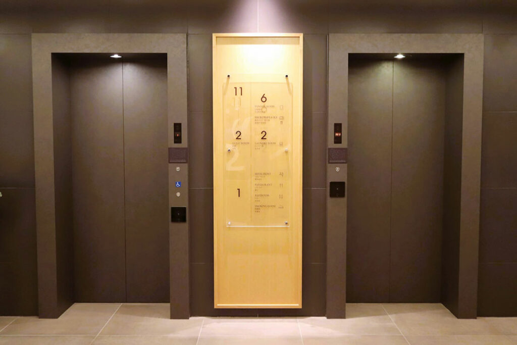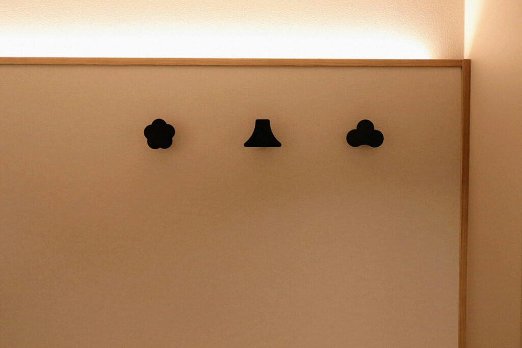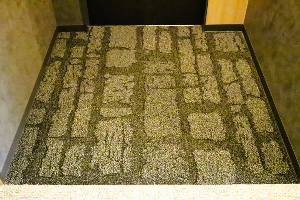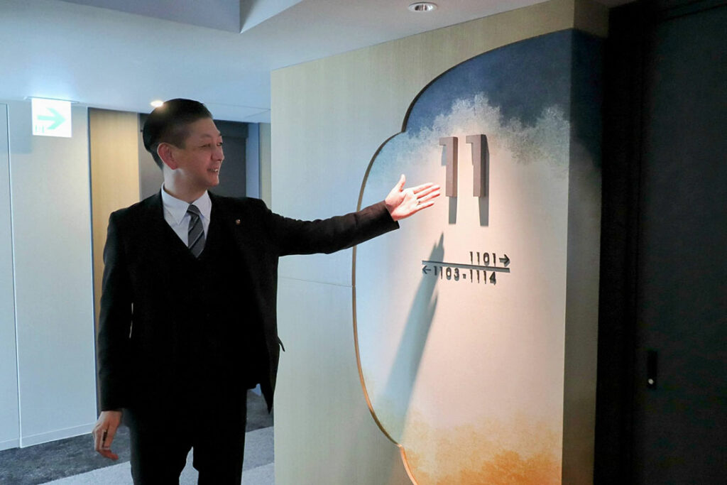 エレベーターホールでは、ロビーで用いた小松石を階数表示にも採用し、素材の連続性を演出。背景には、ロビー絵画にも描かれている摺(すり)の技法のひとつ「一文字ぼかし(いちもんじぼかし)」※ を取り入れ、にじみやかすれを活かして一文字だけを淡く滲ませることで、浅草の “今と昔” が重なるデザインを表現している。床には石畳を想起させるカーペットを敷き、浅草の路地の記憶を動線の中に溶け込ませている。さらに、エレベーターのドアが開くと盆栽が目に入り、和の文化を最初に体感できる仕掛けとなっている。部屋のドアを開ける瞬間には、期待感を高める演出が施されているぞ。