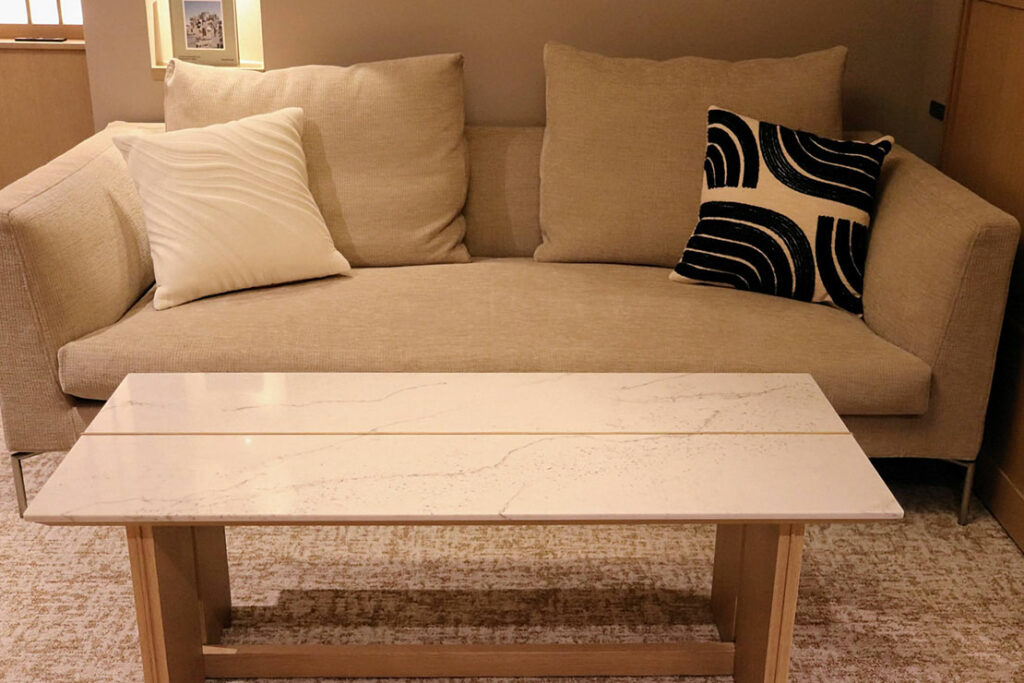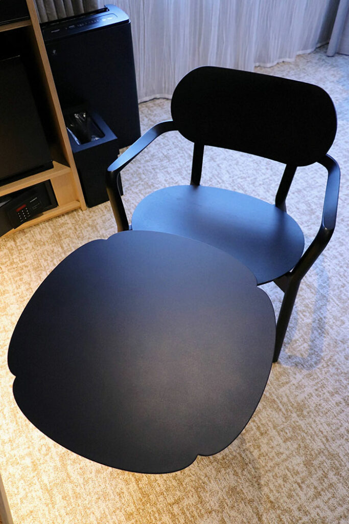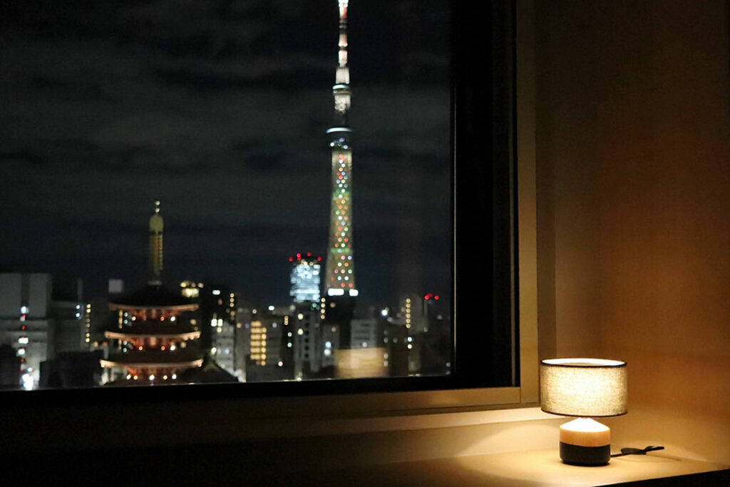 プレシャスコンフォートツイン。まず驚いたのはこの広さ。ダブルルームを連結したツインルームは、想像以上にゆとりがあり、落ち着いて過ごせる空間だ。デザインは “ジャパンディ” をベースにした、北欧のミニマルさと日本の静けさが見事に融合。玄関からカーペットへと続く床の切り替えがあり、靴を脱いで寛げるスタイルはまるで自宅のような安心感。ペンダントライトの下にはデンマークの名門 eilersen 社のソファが置かれていて、座り心地は抜群。格子や障子をイメージしたベッドボードには柔らかな光が映し出され、夜はとてもリラックスできる。テレビ下には急須や茶器が用意され、浅草の工芸品に触れながらお茶を楽しむ時間は特別な体験。さらに、7階以上の客室からは浅草寺や五重塔、東京スカイツリー®が一望でき、まさに “借景” を堪能できる贅沢なひととき。静けさと上質さ、そして浅草ならではの眺望。ここで過ごす時間は、まさに至福そのものだ。