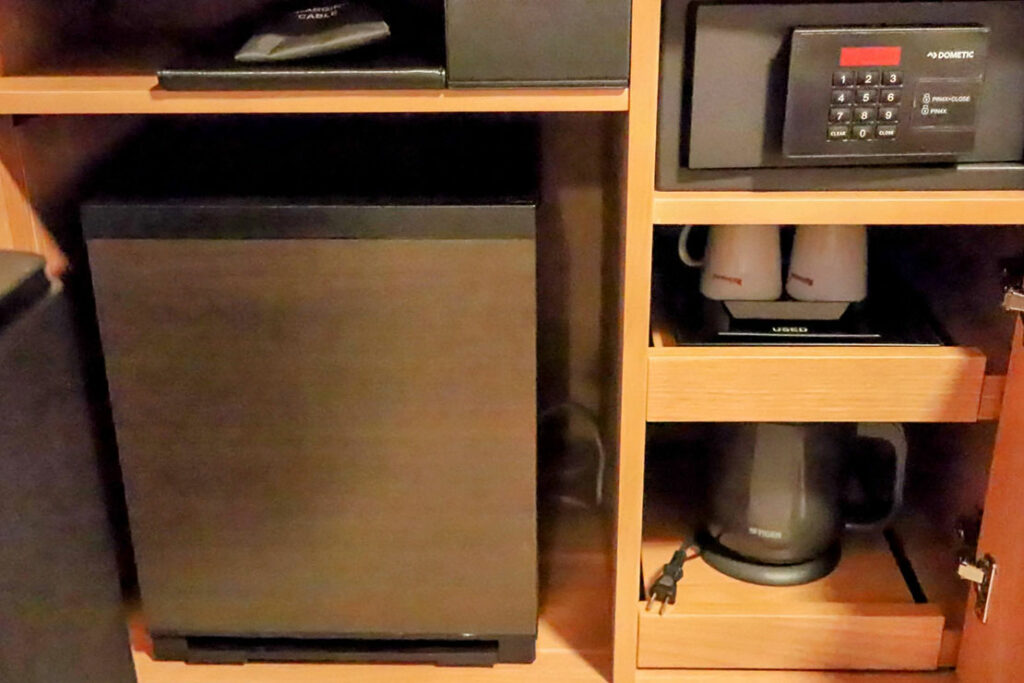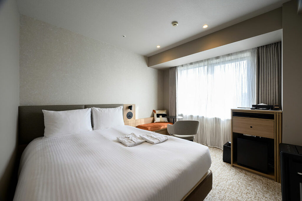 通常のデスクではなくワイドベンチとサイドテーブルが配置されて、ベンチ下は収納として活用できるため、床面がすっきり。荷物を片付けると視界に余白が広がり、客室全体が広々とした印象になる。スタンダードな快適性はしっかり確保され、座って作業するにも、窓際でくつろぐにも不便さは0。むしろ「余白があること」自体が心地よさにつながる感じだ。そして何よりの魅力は眺望。プレシャスモデレートは他の部屋と同じ絶景を楽しめる仕様で、窓からの景色が宿泊という質を一段と高めてくれる。モデレートとの差額はわずか2,000円。正直、この開放感と景色を考えれば、迷う余地はなく。ここはプレシャスモデレート一択!