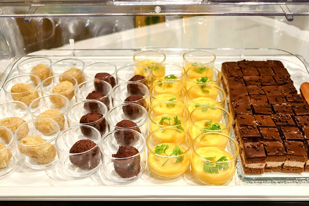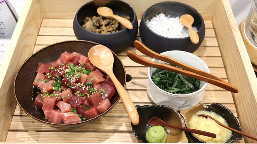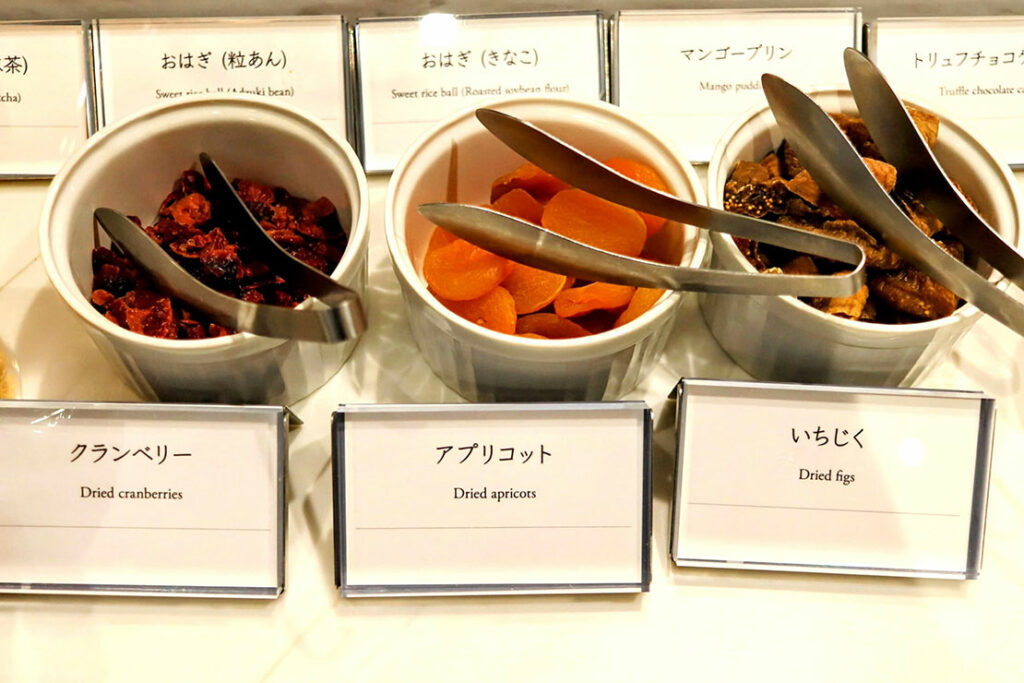 日替わりのデリやホットミール、漬けマグロととろろ、浅草の味として親しまれている⽜すじ煮、わらび餅などの和スイーツも用意。サラダ、フルーツ、温かいパン等、バラエティーなメニューが食欲をかきたてる!