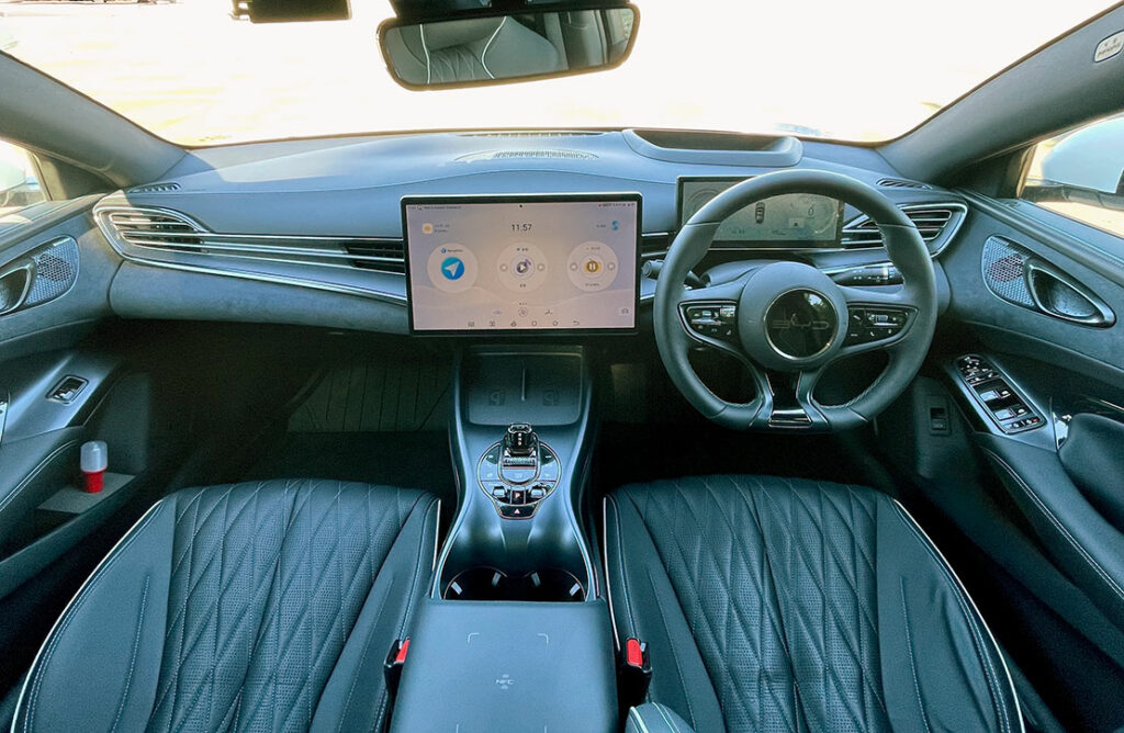 EVの方程式通りバッテリーは床下に。もちろん同ブランドが誇るブレードバッテリーがボディの一部分として敷き詰められており、剛性にも貢献。またバッテリー温度管理システムは日本製の急速充電器にも相性がいいという。そしてクルマの電気を自宅に使えるV2hにも対応するが、中には相性の悪い機器もあるというので、このあたりは確認しておきたいところ。
