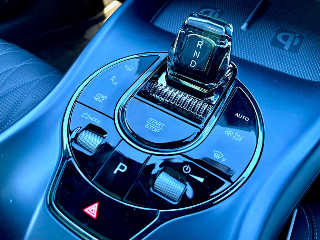 インパネセンターには、お約束のタテにもヨコにもなる15.6インチサイズの大型ディスプレイが厳かに座している。ナビゲーション使用中はタテの方が便利かと想像した。またこのディスプレイからは回生ブレーキの強さを含めたクルマの設定はもちろん、エアコンなどの各種操作が可能。インパネ下にはスマホのQi規格、いわゆる置くだけ充電に対応した充電器が左右1つずつ用意されている。