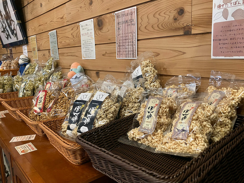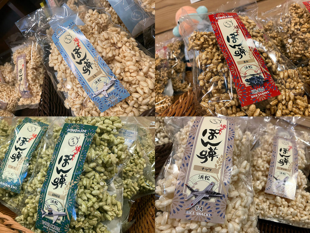 ぽんやのポン菓子には白砂糖を使ったオーソドックスなものを含め9種類のフレーバー、3種の形状(板状、塊状、バラ)があり、店舗での販売のほかイベントでの販売、通販もしているとのこと。もともと「元ブルーのパイロット」ということを前面に出すことには抵抗があったそうですが、研究し、素材にもこだわりぬいて製造しているその商品の評判は知れ渡り、全国から来客や注文が来ているそう。また浜松基地での教官の経歴もあることから現役自衛官や飛行学生の来店も多く、噂を聞きつけた航空機ファンにもリピーターがたくさんいるようです。「ヒコーキのことをまったく知らずに来ていただける人はもちろん、ブルーなどをきっかけにポン菓子のファンになってくれる人も、大歓迎です」と話してくれました。