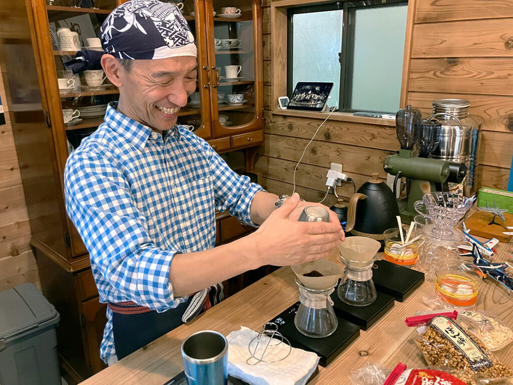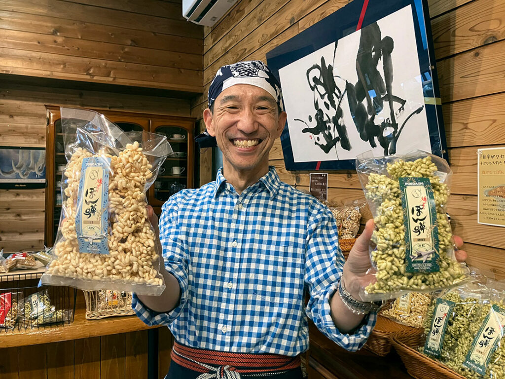 静岡県浜松市天竜区でそのポン菓子を扱う「杏庵 ぽんや」は、元航空自衛隊パイロット、ブルーインパルスの飛行班長としてもお馴染みの元イーグルドライバー/ドルフィンライダー、Suitこと春山維彦さんが開いたお店です。義理のお母様がポン菓子職人で、その味が忘れられずに退官後、お店を始めたそうですが、製造・販売はもちろん、週末祝日にはカフェも営業、若いころから好きだったコーヒーや紅茶もサーブしてくれます。