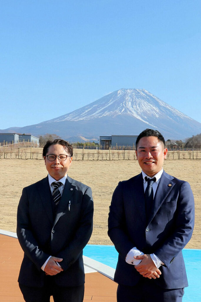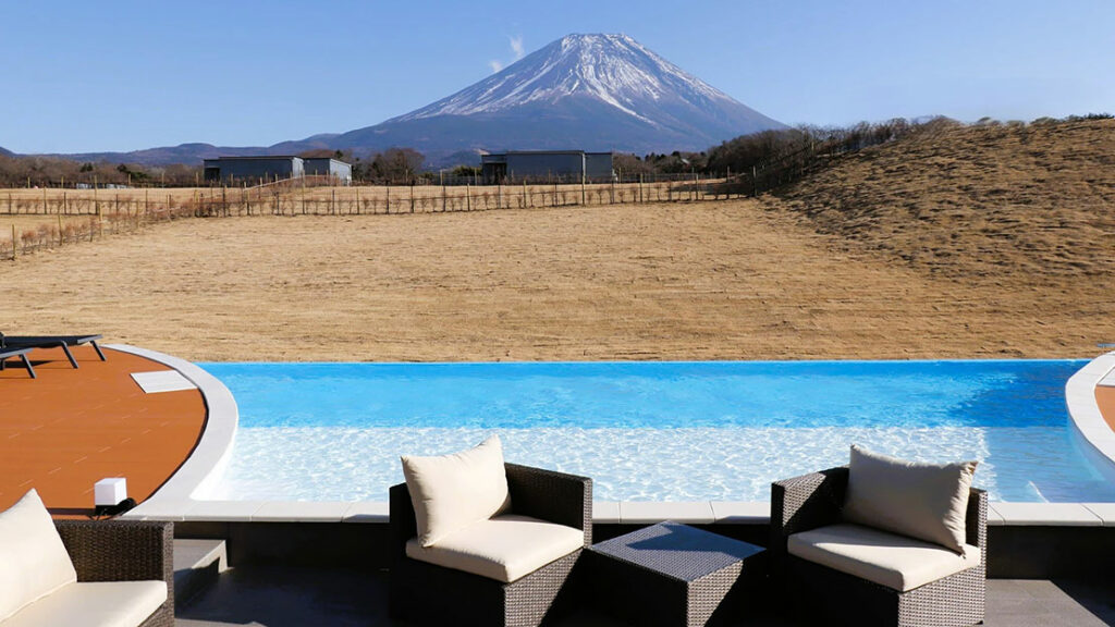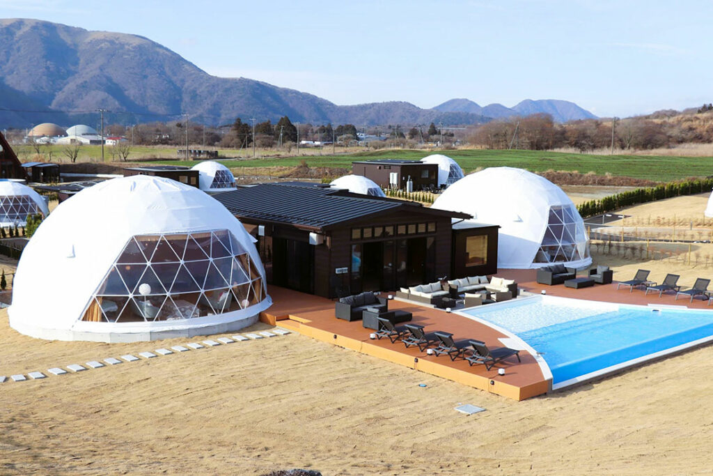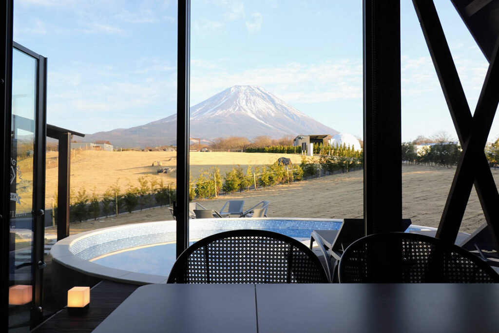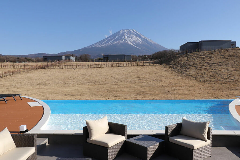 ラグジュアリーツインドームは、日本初仕様となる、直径10mのドームテントを、キッチンリビング棟の両脇に連結させた造り。最大で20名が宿泊できる! 目の前には富士山。その富士山の形を模したプライベートプールを備えた超大型の客室だ。