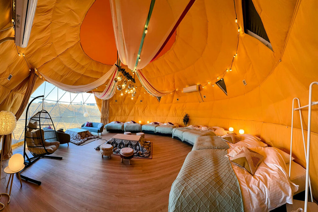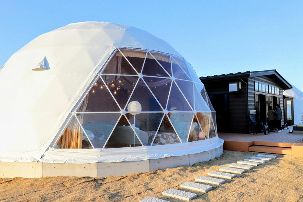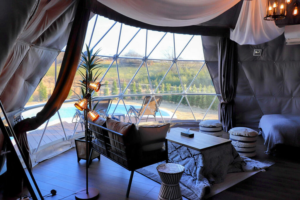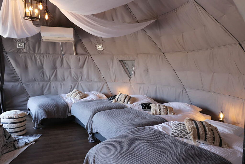 ■ベッド数 :simmons製セミダブルベッド8台、追加寝具2組 ×2棟。8ベッドの10mドームテント2棟を利用可能。