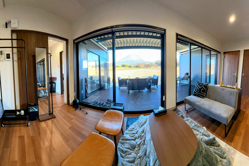三角屋根の非日常感あふれる開放的なヴィラ。プライベートプールを完備し上質な時間を演出します。室内にはキッチンを備え、また寝室が1階と2階にわかれているので、グループや2世帯での利用にも最適。富士山を眺め過ごす、ここにしかない贅沢な時間だ。