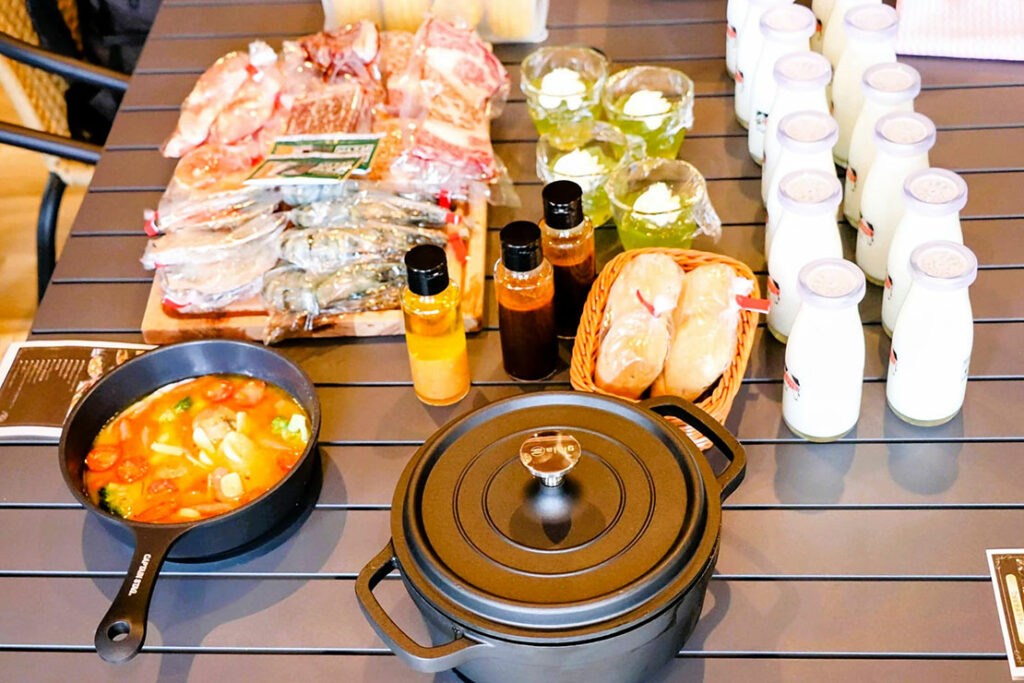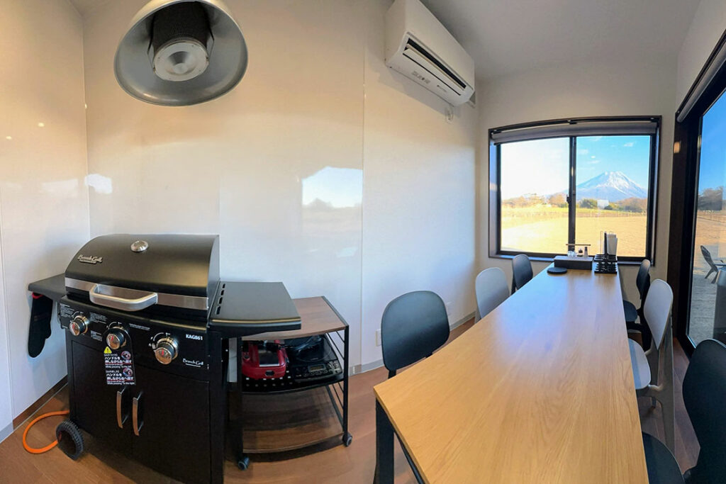 食材はいずれも山梨・河口湖エリアの旬の食材やブランド牛を使用したこだわりの厳選素材が提供される。食材は、・甲州牛サーロインステーキ・甲州牛ももステーキ・信玄鶏もも焼き・殻付きホタテ・大海老・ジャンボしいたけ・季節の野菜各種・静岡県産コシヒカリ・特製ブイヤベース・ソーセージとモッツアレラチーズのアヒージョ・ライ麦パン・シャインマスカットゼリー全12品(仕入れにより変更もあり)。素泊まりルームチャージ金額との差額は、プレミアムドーム(朝食付き)で約1万円。絶景グルメを味わうなら食事つきが間違いなし! 素泊まり食材持込でも備え付けのBranch Grill製のBBQグリル他備品は無料で使うことが出来るのが嬉しい。