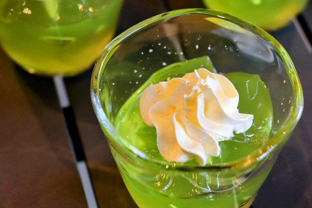 シャインマスカットゼリー。ゼリー部分はほんのり甘さ控えめで、シャインマスカットの芳醇な香りと上品な甘みが特徴なデザート。