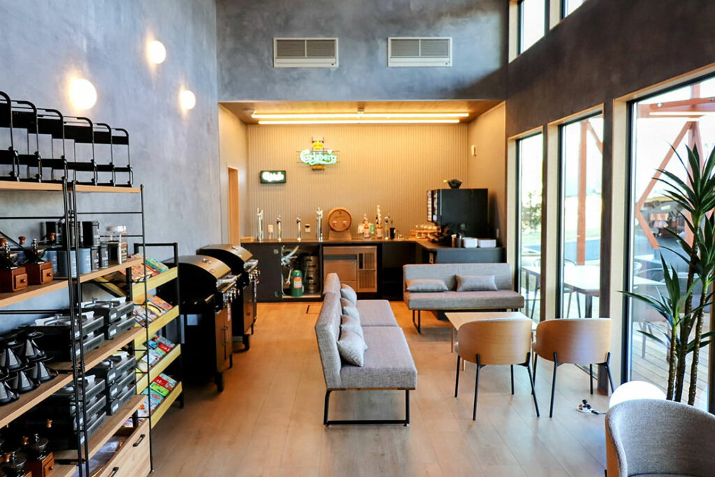 ロッジ風の管理棟内は、チェックインカウンターだけではなく、無料貸し出しのボードゲーム、滞在中は一切料金のかからないアルコールやソフトドリンクを自由に楽しめるインクルーシブサービスが嬉しい。