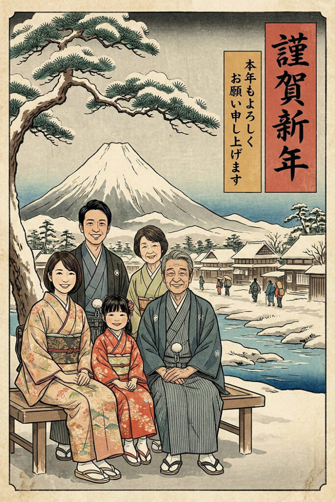 モノクロはAIで実際の写真の立ち位置までデザインしてくれる優れものだ。浮世絵バージョンでは、お正月らしい和装でどこか懐かしいノスタルジックなものに仕上げてくれる。