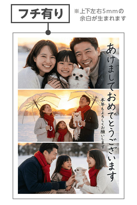 写真(印画紙)をはがきに貼り合わせます。ふち無しの全面プリントをする事ができます。また、写真が綺麗に仕上がりますので、写真がメインになる挨拶状に適しています。