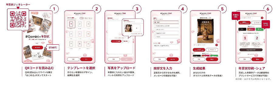 Gemini で作成した特設サイトURL にアクセスし、専用ジェネレーターより、9つのテンプレートから好きなテンプレートを選択。指定した画像 (複数枚可能)をアップロードし、オリジナル年賀状画像を生成。 オリジナルのテキストメッセージを追加でき、縦横比も調整ができる。その後「郵便局のプリントサービス」内の専用ページから、年賀状印刷の申込も可能だ。