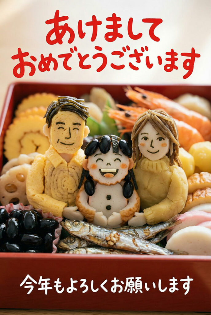 撮影した画像をお正月らしいお節料理風にAIアレンジ。ほっこりする1枚に仕上がる。