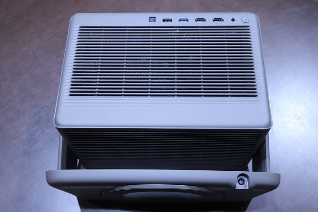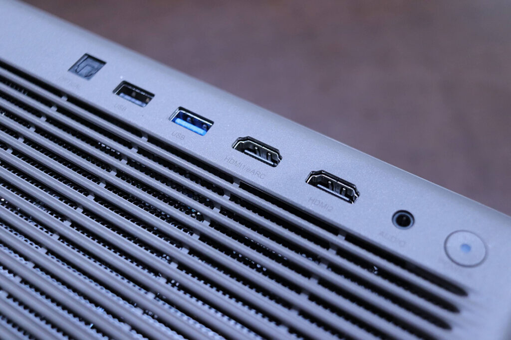 使用時には本体内部の熱を強制的に排出する通気口を備え、入力端子として DC入力 ×1、HDMI ×2(HDMI1は eARC 対応)、USB 3.0 ×1、USB 2.0 ×1 を搭載する。また、出力端子として光デジタル音声出力 ×1、オーディオ出力 ×1 を備える。