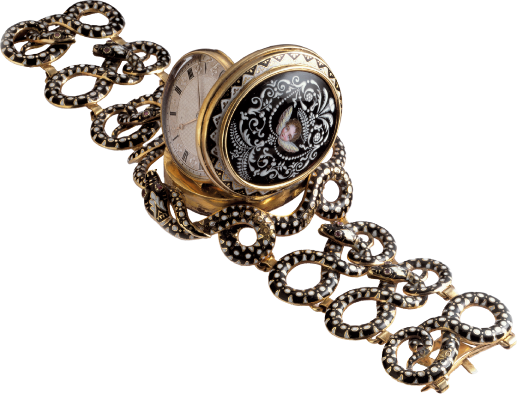 さらに18世紀後半になるとパリやジュネーブの時計師が時計付きの指輪やブレスレットを製作したという記録が残る。ナポレオン1世の末妹、ナポリ王妃カロリーヌ・ミュラは1810年、当時、最高かつ大人気の時計師アブラアン・ルイ・ブレゲにブレスレット・ウオッチを注文し、2年がかりで製作された。今日も保存されるブレゲの台帳がその証拠だ。