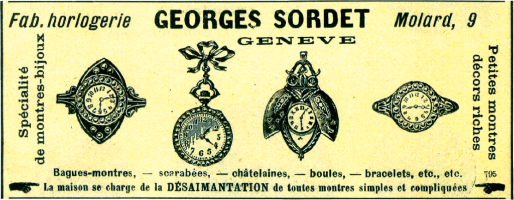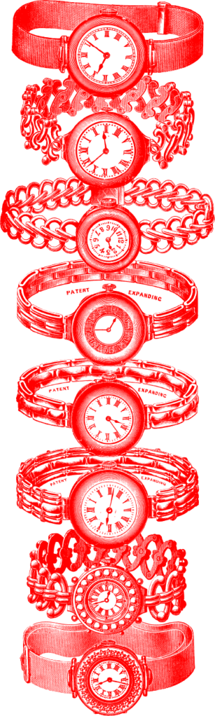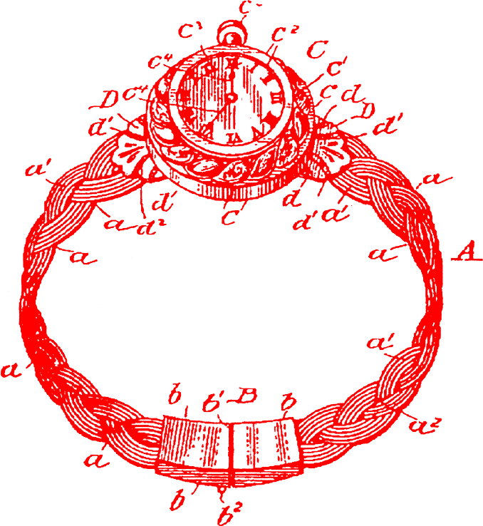 このなかに手持ちの懐中時計をセットし、 腕時計に変えることができるブレスレットがある。またアメリカでも前述のような、さまざまなブレスレットやストラップが考案された。このころイギリスやアメリカでは鉄道が敷設され、タイムテーブルを基準に運行される汽車に乗るには時計は必需品。そこで実用的で、しかも女性らしさを感じさせる腕時計を着けることが女性たちのトレンドとなったのだろう。
