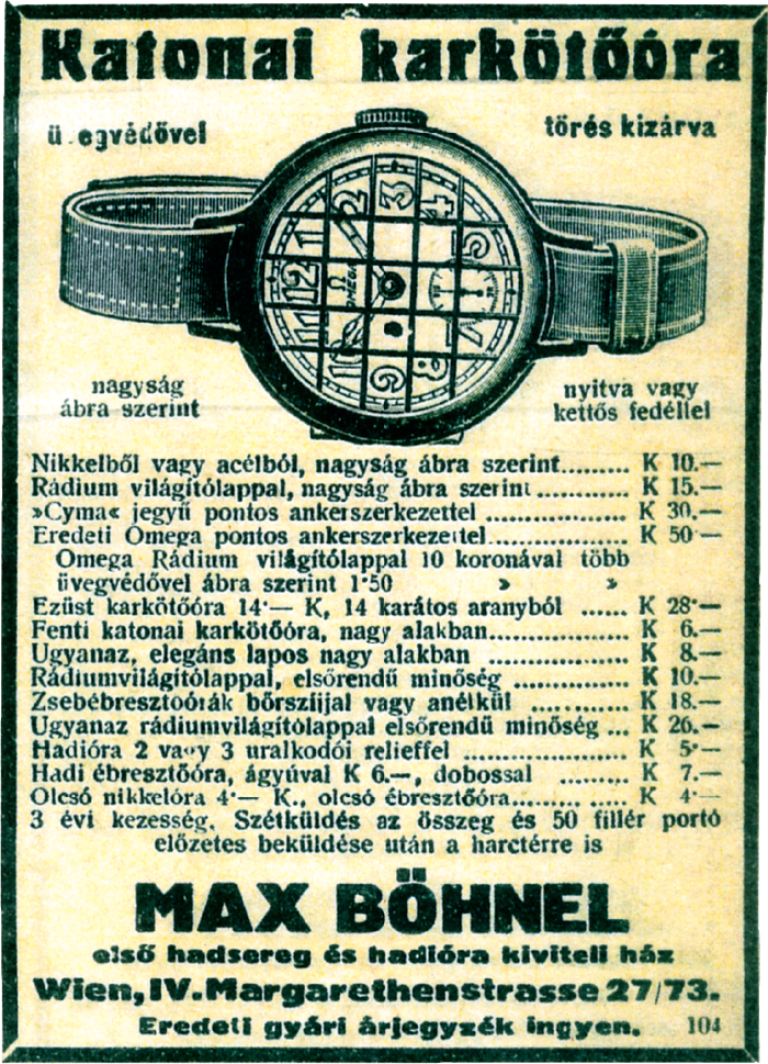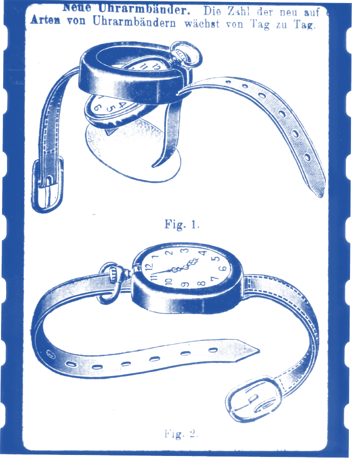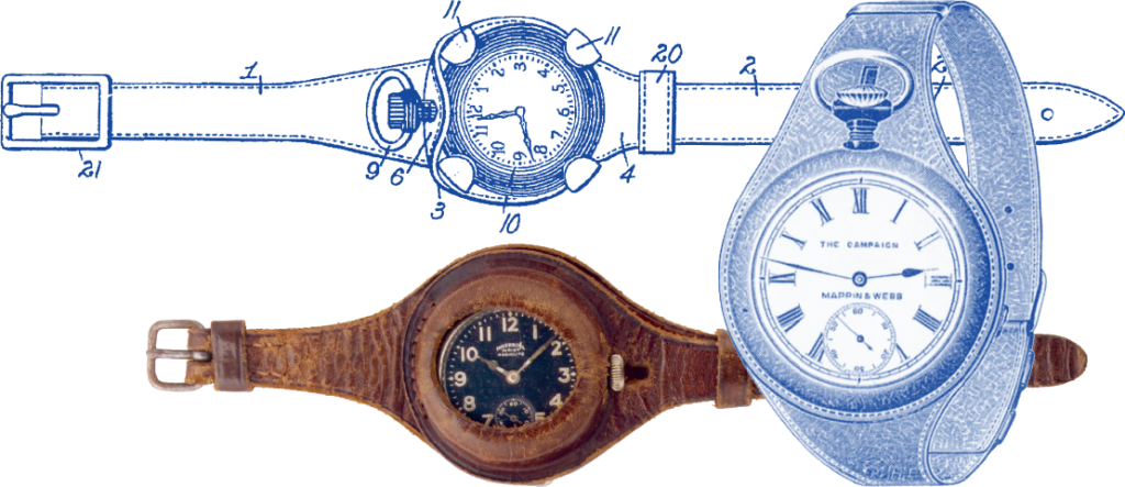 多くの男たちがこのことに気づくのは実に遅かった。きっかけは戦争。1899年に南アフリカで起きた第2次ホーア戦争で、イギリス軍将校が懐中時計をポケットから出すよりも腕に巻いた方が即座に時刻が分かる、という理由から懐中時計をストラップ付きのレザーケースに入れて、手首に巻きつけた。これが軍用腕時計の始まりといわれている。ひとたび腕に時計を着けることの便利さに気づくと、懐中時計を腕時計に変えるための新奇なアイデアが次々と考案された。