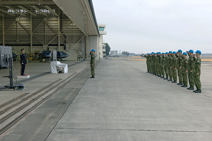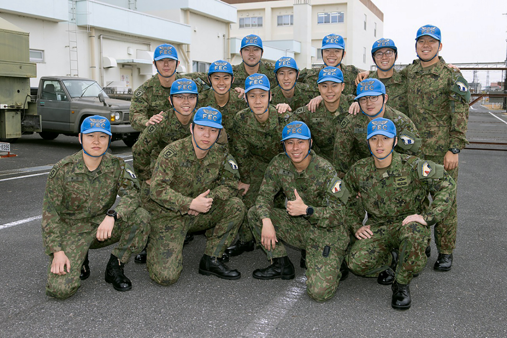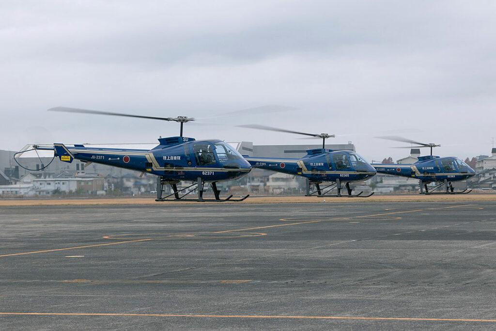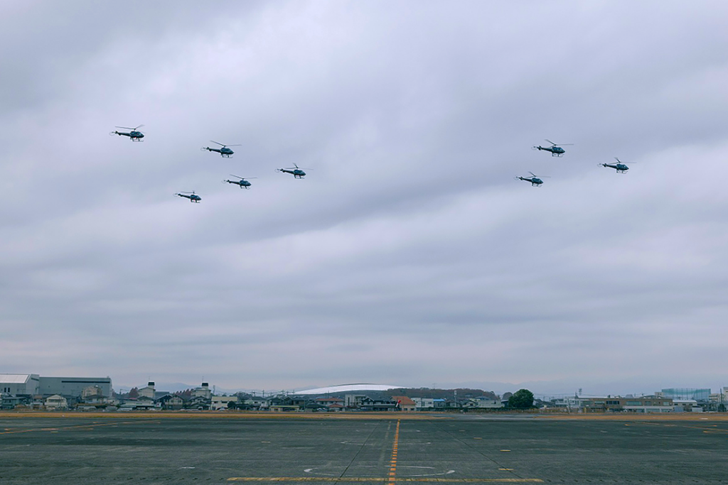陸上自衛隊では、パイロットのうち約7割をFECの出身者が占めています。今期は警察庁預託学生1名を含む卒業生15名が本教育の集大成とも言える卒業編隊飛行に臨み、学校職員や在校生、卒業生の家族が見守るなか、初等練習ヘリコプターTH-480B 8機で編隊飛行を披露しました。