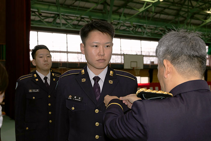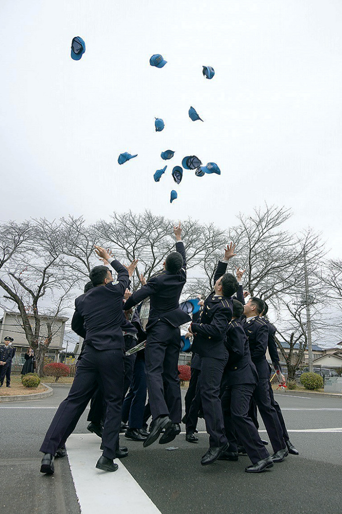 飛行訓練の後には、駐屯地体育館で卒業式が行なわれ、陸自のFEC学生14名に航空操縦士の証である航空き章(ウイングマーク)が授与されました(警察庁預託学生には修了証を授与)。また後期教育の機種・教育地に関する命令伝達、卒業生の申告、卒業訓示などが行なわれ、最後の壮行行事は、恒例となっている「帽子投げ」で締めくくられました。
